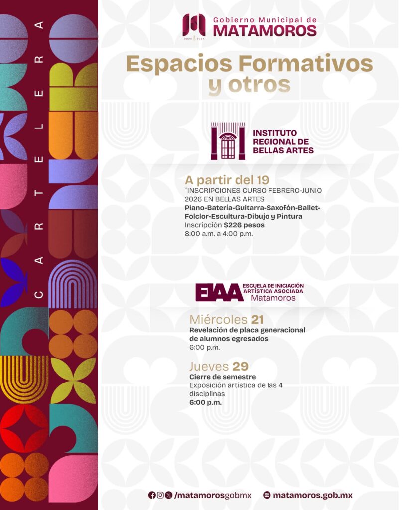 Matamoros, Tam.- El Gobierno de Beto Granados continúa impulsando la cultura en Matamoros como un eje fundamental para la formación de nuevas generaciones, convencido de que el acceso al arte y al conocimiento fortalece el desarrollo social y educativo de la ciudad. A través de una amplia agenda cultural, la administración municipal promueve actividades que permiten a niñas, niños, jóvenes y adultos acercarse a expresiones artísticas que refuerzan la identidad y el arraigo cultural.