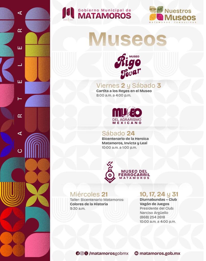 Como parte de esta estrategia, se han activado bibliotecas, museos y espacios formativos, los cuales se han convertido en puntos clave para el aprendizaje y la convivencia. Talleres, charlas, actividades infantiles, exposiciones y programas educativos se desarrollan en recintos como bibliotecas públicas, museos históricos y artísticos, así como en instituciones dedicadas a la enseñanza de las bellas artes, consolidando espacios formativos que hoy permiten que brilla Matamoros desde la educación y la cultura.