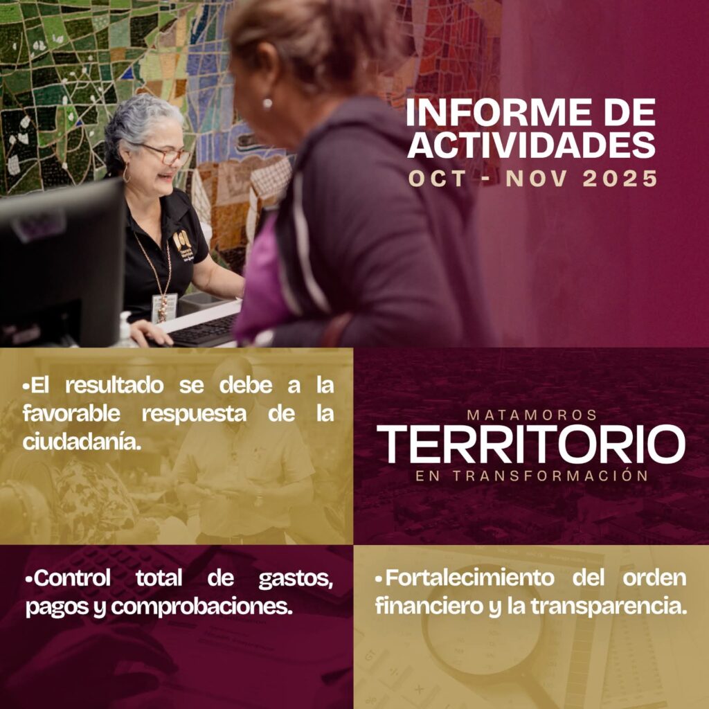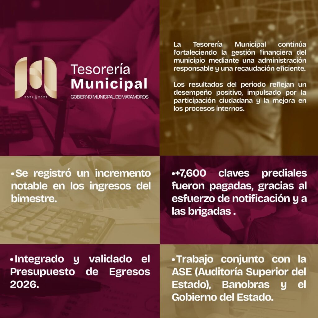 Matamoros, Tam.- Durante el presente periodo, el Gobierno de Beto Granados, a través de la Tesorería Municipal, avanzó de manera significativa en el fortalecimiento de la gestión financiera del municipio, impulsando una administración responsable, ordenada y enfocada en el uso eficiente de los recursos públicos, con el objetivo de que brille Matamoros.