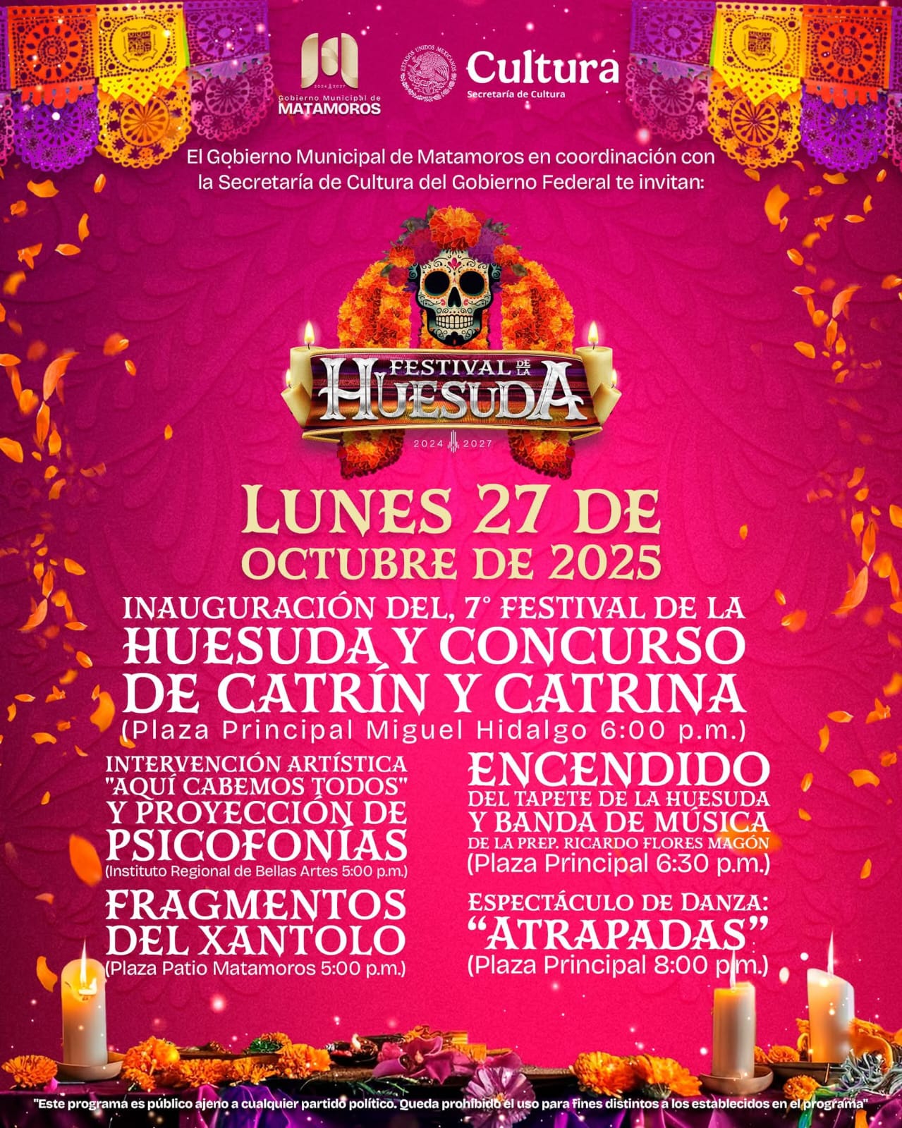 H. Matamoros, Tamaulipas.- El Gobierno de Beto Granados invita a toda la ciudadanía a disfrutar del 7.º Festival de la Huesuda, una celebración que llena de color, tradición y cultura las calles de Matamoros. Este importante evento será inaugurado el próximo lunes 27 de octubre, con el propósito de rendir homenaje a nuestras raíces y fortalecer el orgullo por las expresiones artísticas y culturales de la región.