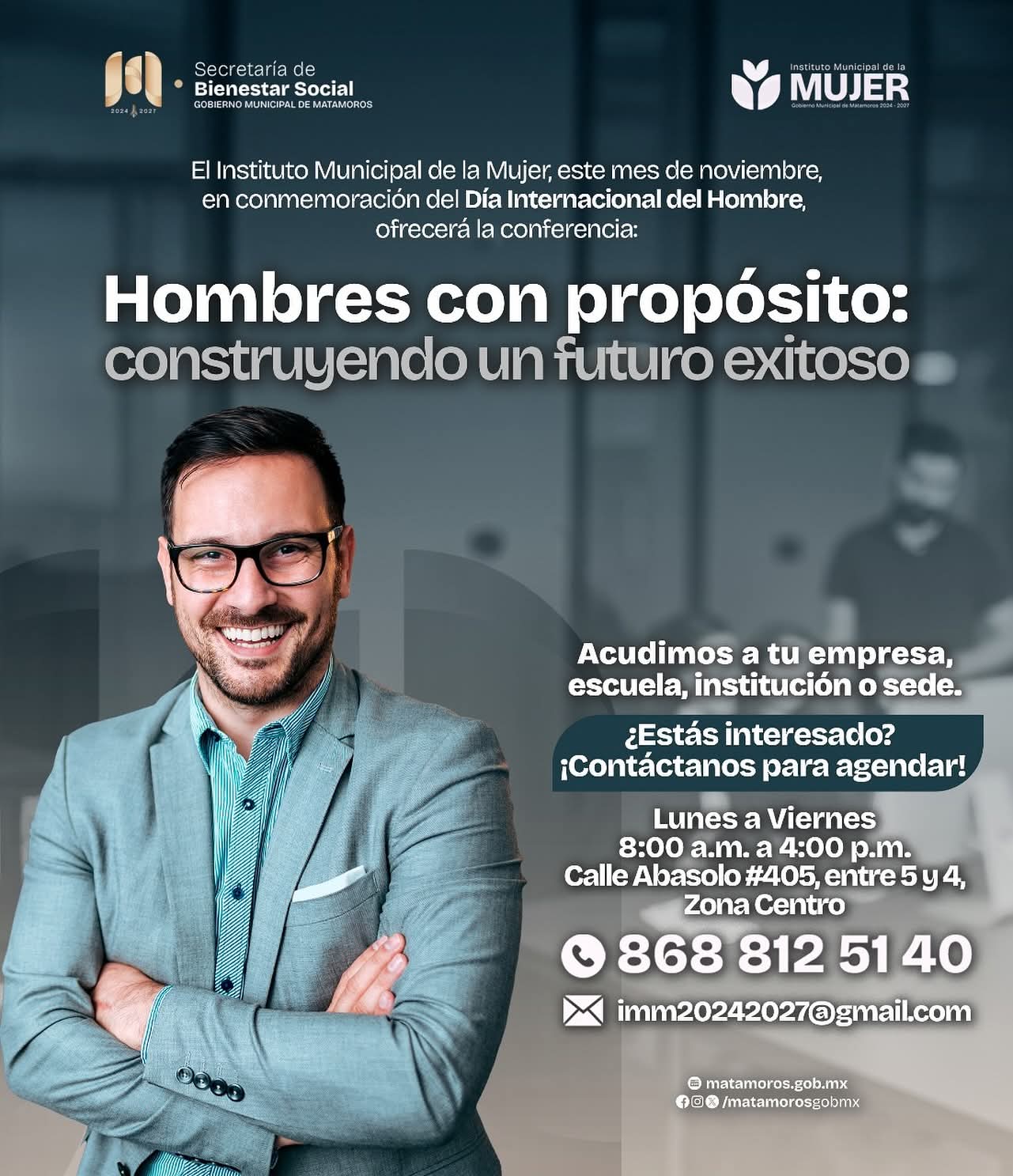 Matamoros, Tam.- En el marco del Día Internacional del Hombre, el Gobierno de Matamoros que encabeza Beto Granados, a través del Instituto Municipal de la Mujer, invita a participar en la conferencia “Hombres con propósito: construyendo un futuro exitoso”, una iniciativa enfocada en fortalecer el bienestar, la salud emocional y el desarrollo personal de los hombres en nuestra comunidad.