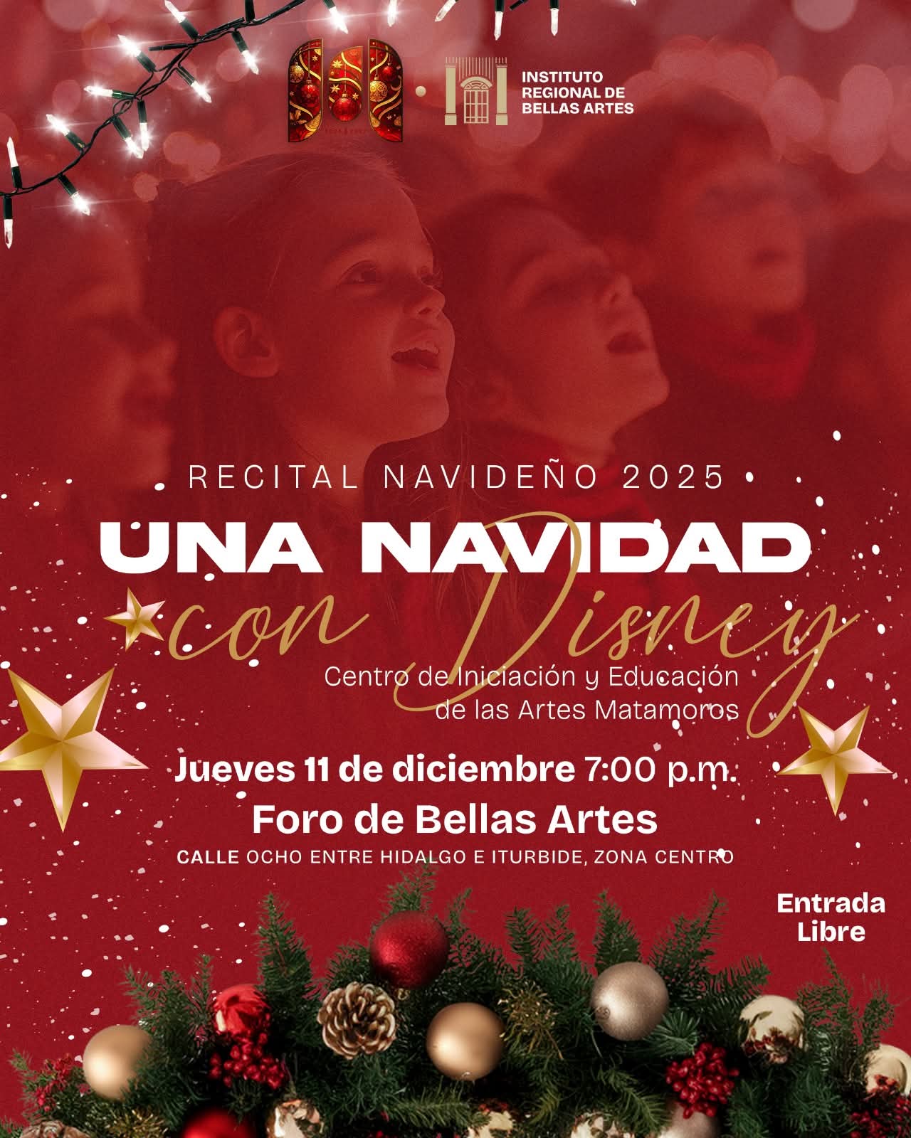 Matamoros, Tam.- El Gobierno de Beto Granados continúa fortaleciendo las expresiones artísticas y culturales en la ciudad, al respaldar actividades que permiten que brille Matamoros durante esta temporada decembrina. En este marco, este jueves se presentará un recital que revive los clásicos navideños más entrañables de Disney, a cargo de las y los alumnos del Centro de Iniciación y Educación de las Artes.