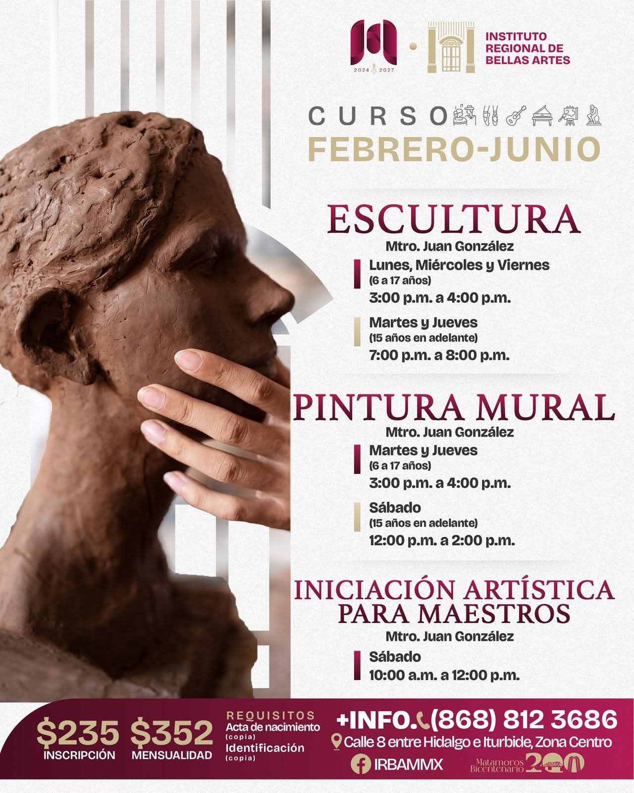 Matamoros, Tam.- El Gobierno Municipal de Matamoros, encabezado por el alcalde Beto Granados, continúa fortaleciendo la oferta cultural en la ciudad mediante la apertura de inscripciones a diversos cursos artísticos en el Instituto Regional de Bellas Artes Matamoros.
