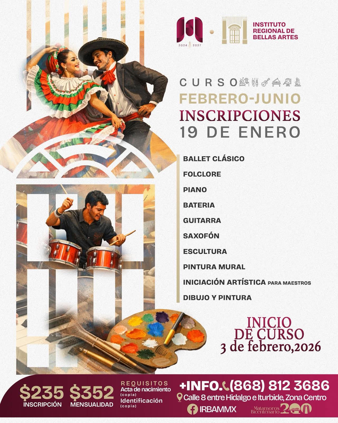 H. Matamoros, Tamaulipas.- El gobierno de Beto Granados hace una cordial invitación a la ciudadanía a inscribirse en los cursos artísticos que ofrece el Instituto Regional de Bellas Artes Matamoros para el periodo febrero–junio, una iniciativa que busca fortalecer el desarrollo cultural y creativo de niñas, niños, jóvenes y adultos en la ciudad.