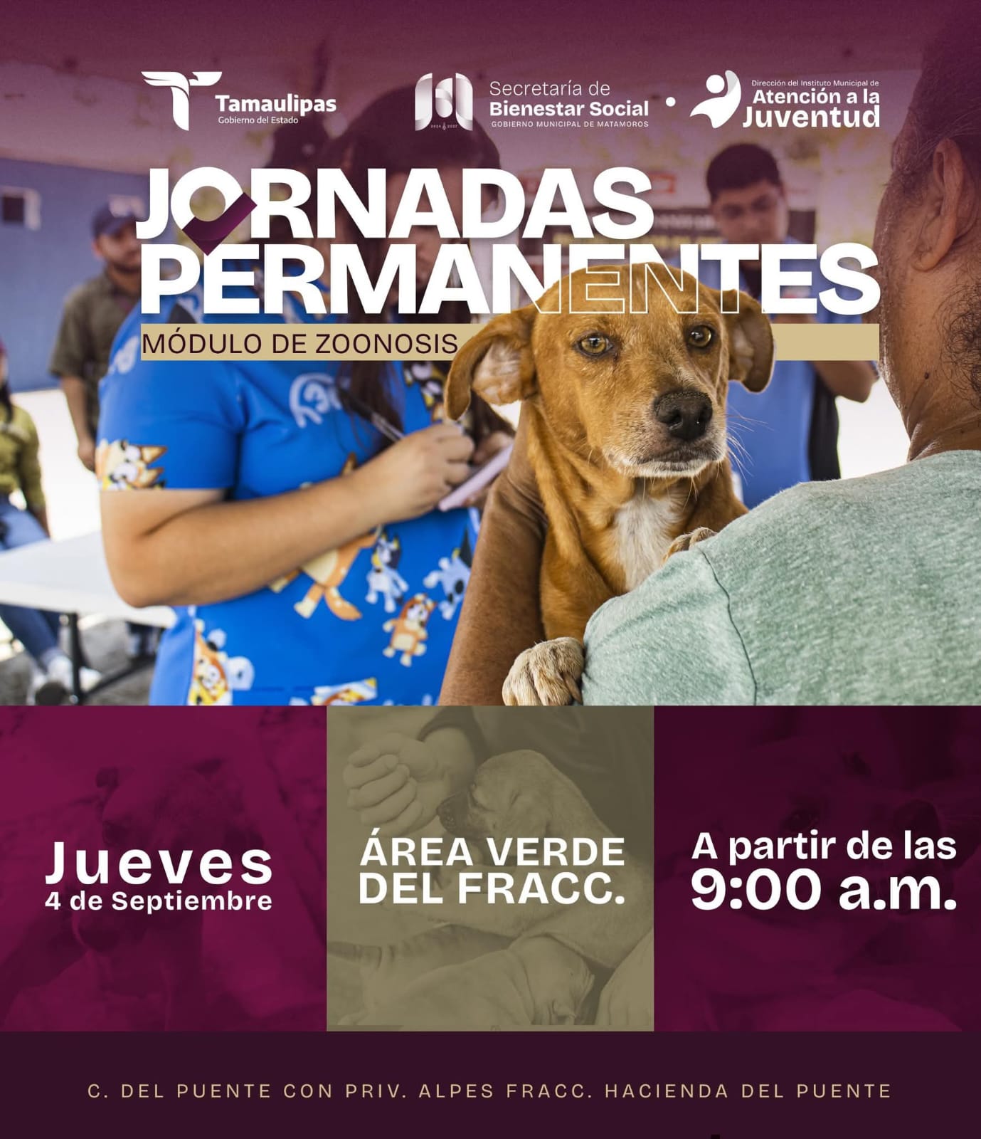 H. Matamoros, Tamaulipas.- El gobierno de Beto Granados extiende una cordial invitación a la comunidad de Matamoros para que participe en la jornada permanente de atención a mascotas, como parte de las acciones que promueven la salud pública y el bienestar animal. Esta actividad se llevará a cabo el jueves 4 de septiembre en el área verde del Fraccionamiento Hacienda del Puente, en la intersección de la calle Del Puente con Privada Alpes, a partir de las 9:00 a.m.