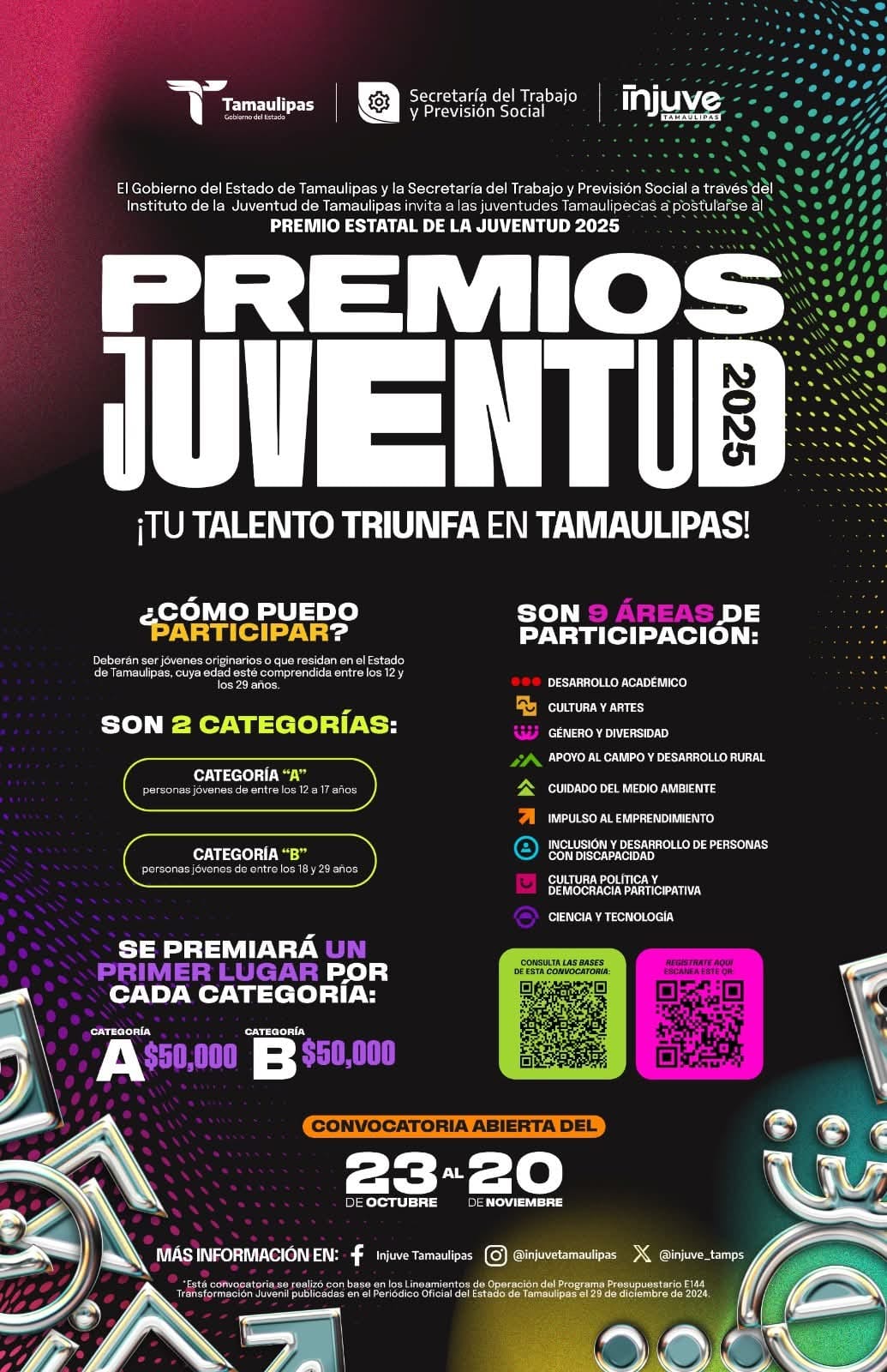 Matamoros, Tam.- El Gobierno de Beto Granados, comprometido con el impulso y desarrollo de las nuevas generaciones, invita a las y los jóvenes de Matamoros a participar en el Premio Estatal de la Juventud 2025, una convocatoria que reconoce el talento, la creatividad y el esfuerzo de quienes destacan en distintos ámbitos y contribuyen al crecimiento de Tamaulipas.