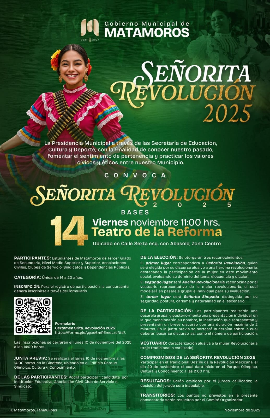Matamoros, Tam.- El Gobierno Municipal de Matamoros, que encabeza Beto Granados, a través de la Secretaría de Educación, Cultura y Deporte, invita a las jóvenes matamorenses a participar en el certamen Señorita Revolución 2025, un evento que celebra el orgullo, la historia y el talento de la juventud matamorense.