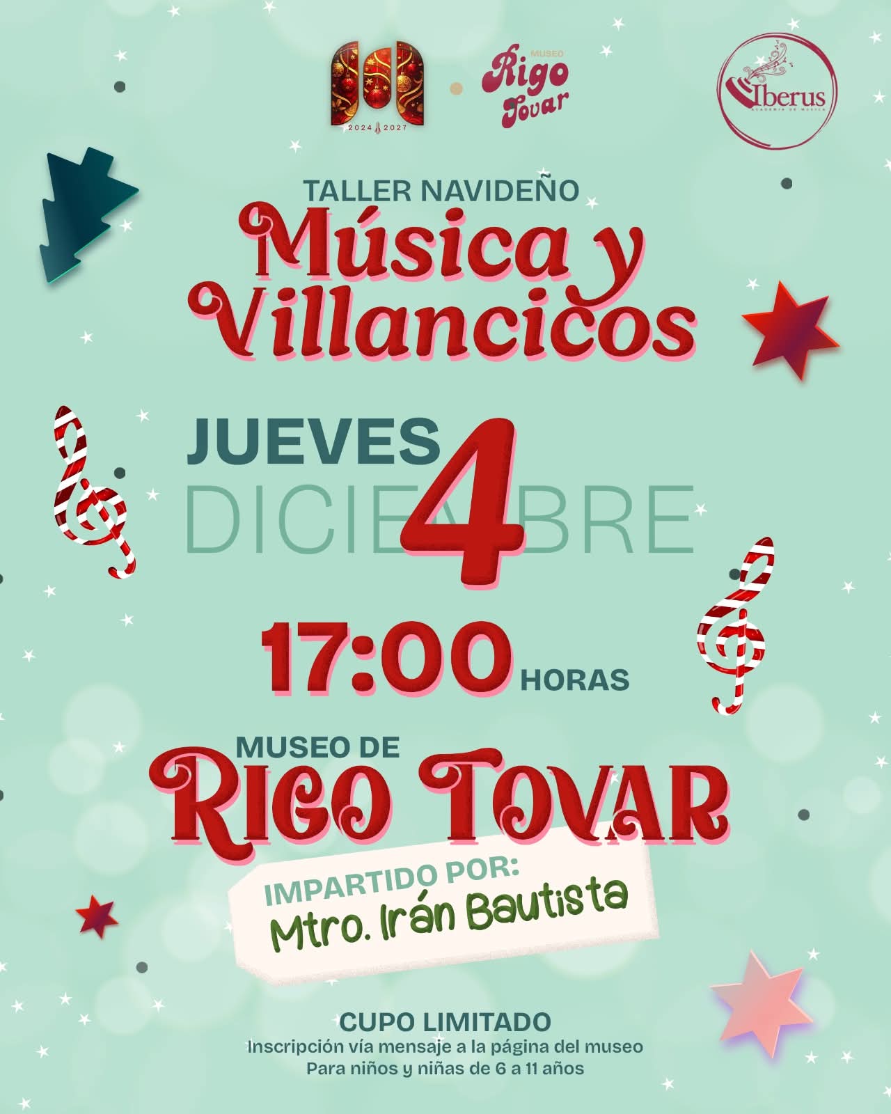 H. Matamoros, Tamaulipas.- El gobierno municipal que encabeza Beto Granados invita a todas las niñas y niños de Matamoros a participar en un taller navideño de música totalmente gratuito, que se llevará a cabo este jueves 4 de diciembre en el Museo Rigo Tovar, una actividad pensada para que que brille Matamoros a través del talento y la creatividad de su niñez.