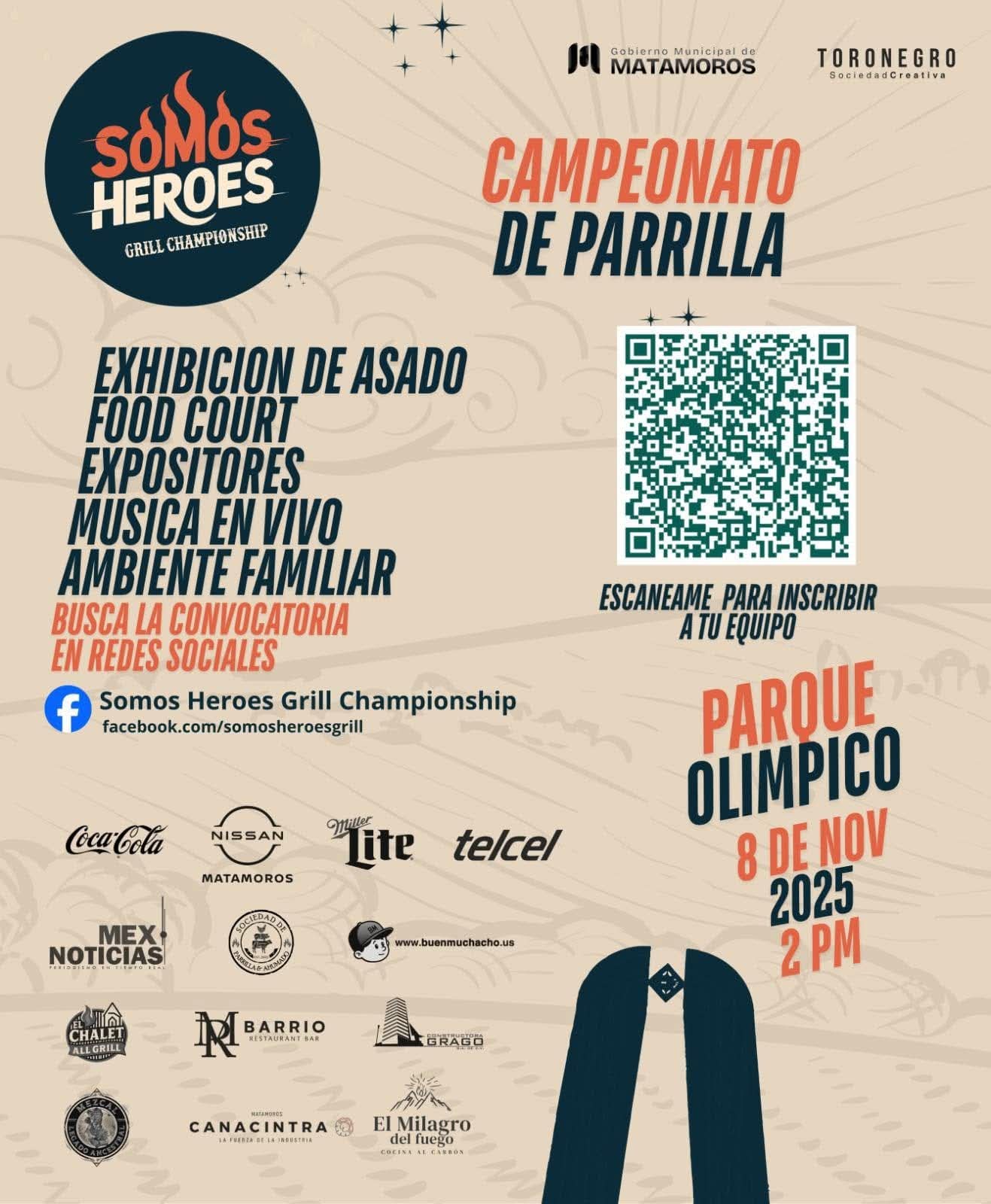 Matamoros, Tam.– El Gobierno de Beto Granados invita a la ciudadanía a disfrutar del Campeonato de Parrilla “Somos Héroes Grill Championship”, un evento que reunirá a los mejores equipos parrilleros en un ambiente familiar lleno de sabor, música y diversión. La cita es el 8 de noviembre de 2025, a partir de las 2:00 de la tarde, en el Parque Olímpico.