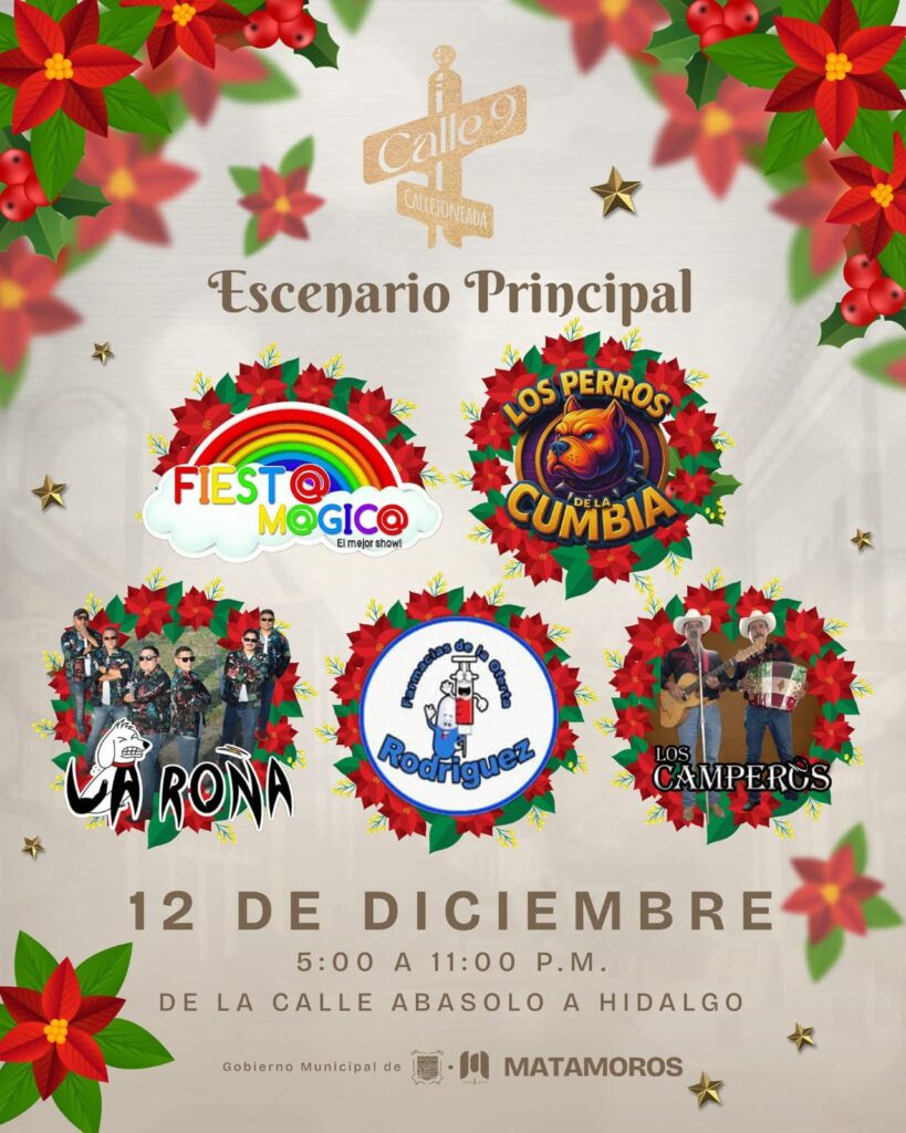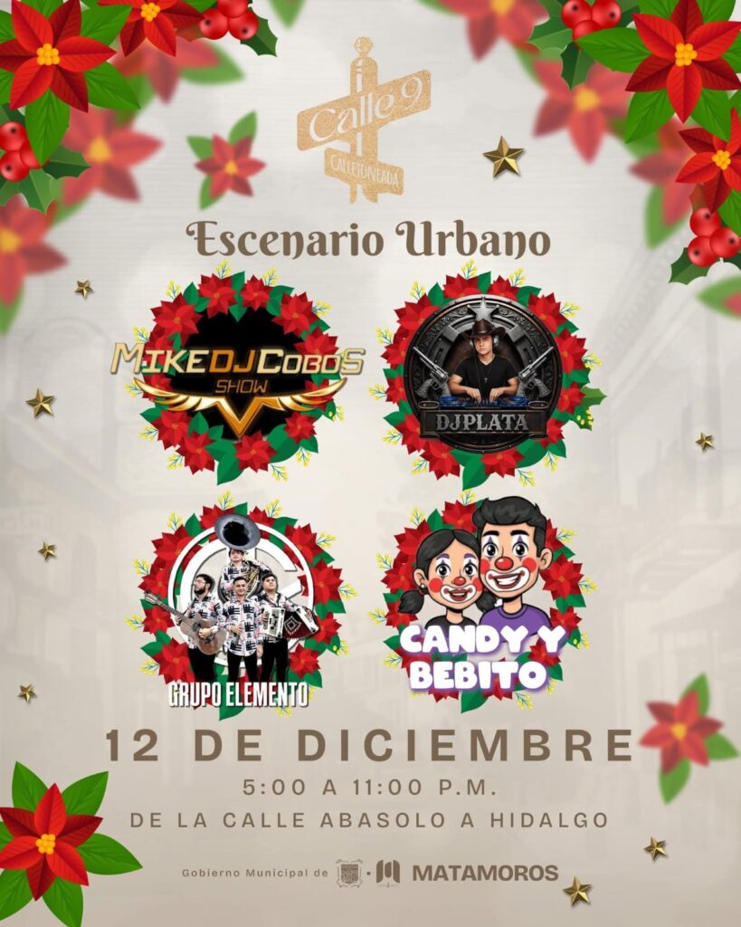 Matamoros, Tam.- El Gobierno de Beto Granados invita a todas las familias matamorenses a disfrutar de una jornada llena de música, tradición y espíritu festivo este 12 de diciembre en la emblemática Calle 9, que se convertirá en un corredor navideño desde las cinco de la tarde hasta las once de la noche. El tramo de Abasolo a Hidalgo recibirá a miles de visitantes con actividades especialmente preparadas para celebrar en comunidad.