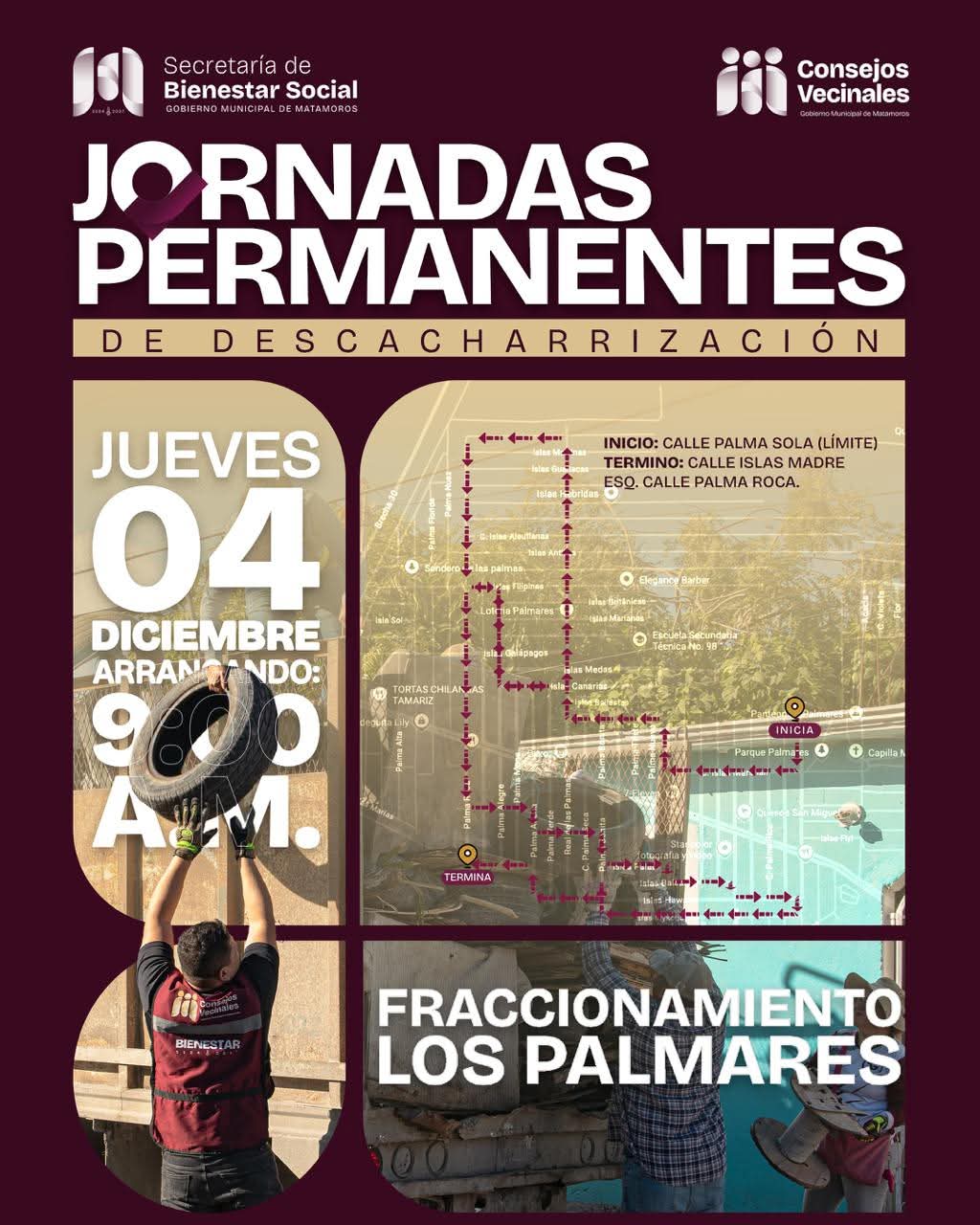 Matamoros, Tam.- El Gobierno Municipal continúa impulsando acciones para fortalecer el cuidado de la salud pública y la calidad del entorno urbano. Como parte de las Jornadas Permanentes de Descacharrización, este jueves 04 de diciembre las cuadrillas municipales llegarán al Fraccionamiento Los Palmares para realizar labores intensivas de limpieza.