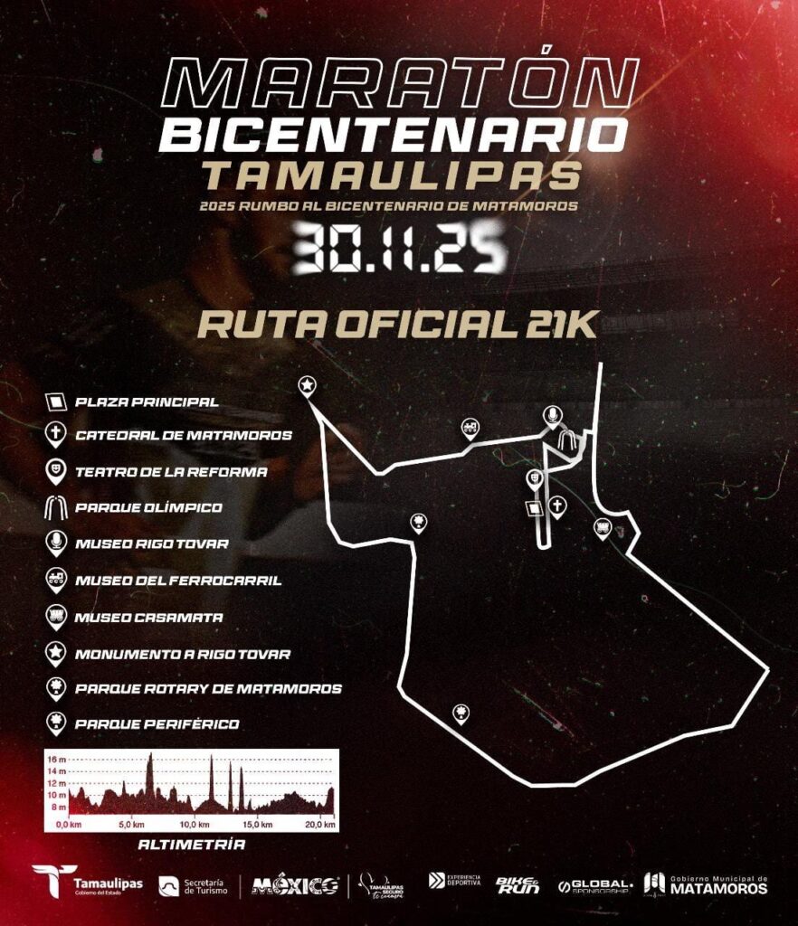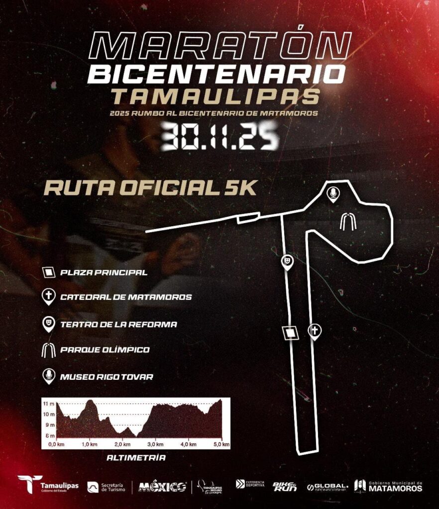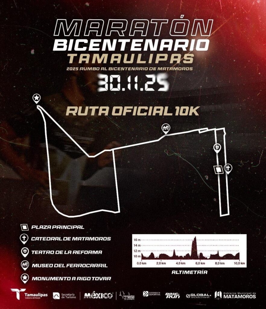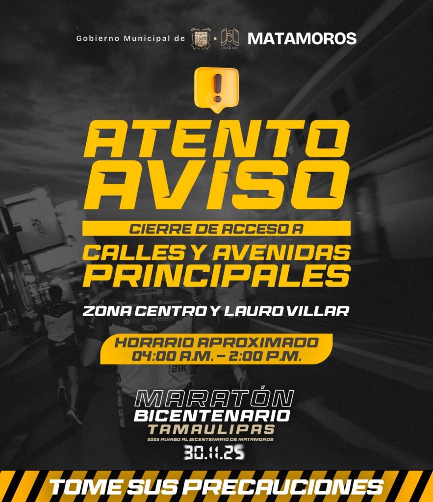 Matamoros, Tam.- El Gobierno Municipal que encabeza Beto Granados informó que este próximo domingo 30 de noviembre diversas vialidades de Matamoros formarán parte del recorrido del Maratón Rumbo al Bicentenario 2025, por lo que se implementarán cierres temporales en calles de la Zona Centro Centro y Av. Lauro Villar.