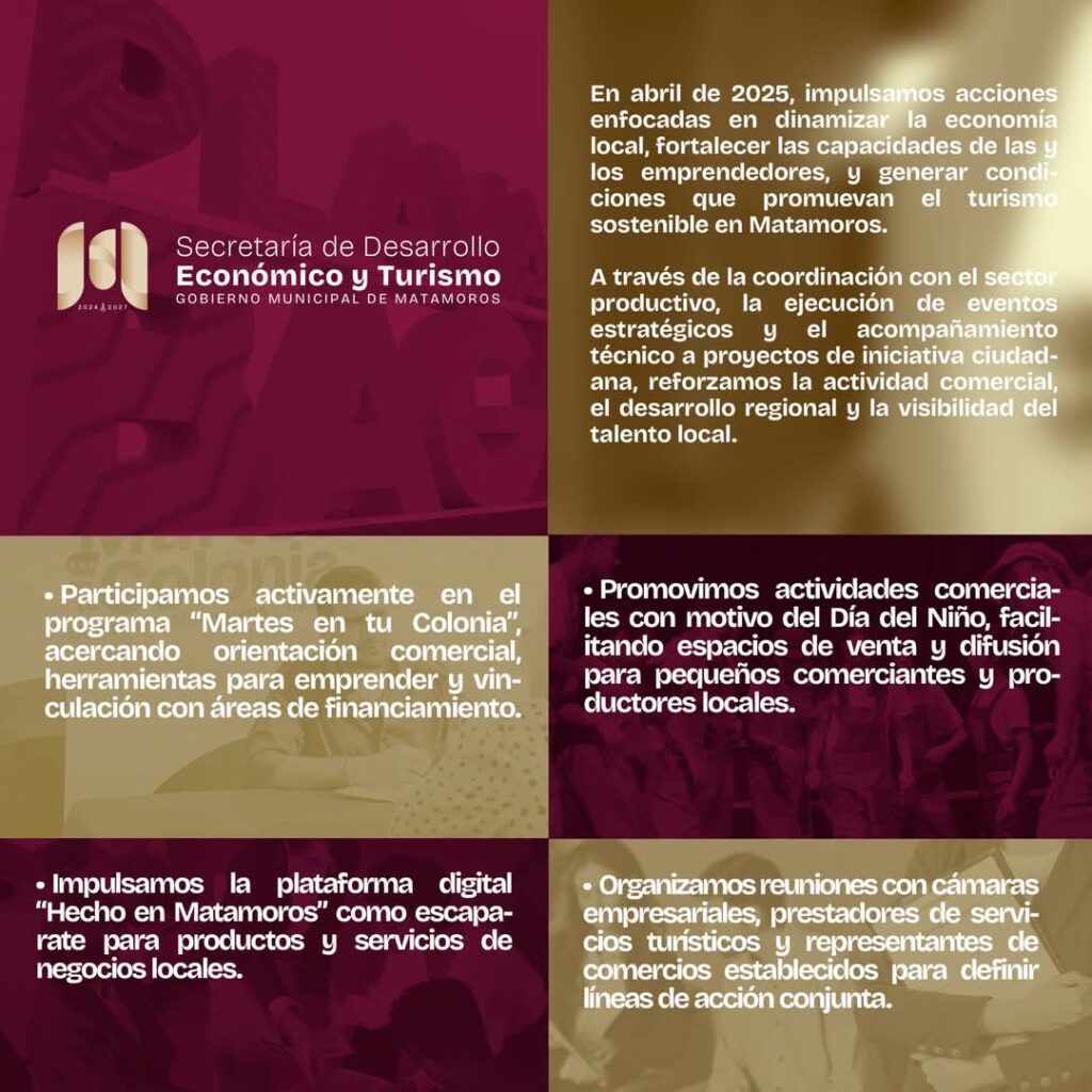 H. Matamoros, Tamaulipas.- El Gobierno de Matamoros, presidido por Beto Granados, informó que en abril, la Secretaría de Desarrollo Económico y Turismo implementó acciones que fortalecieron el comercio local y promovieron el turismo en la ciudad. Estas acciones buscan generar espacios para el crecimiento de negocios y la proyección cultural de Matamoros.