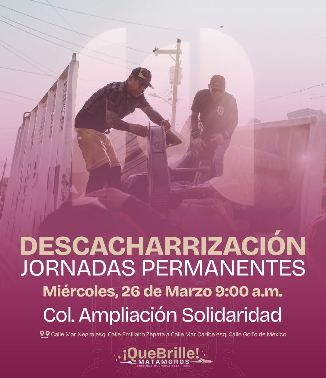 H. Matamoros, Tamaulipas.- El gobierno municipal de Matamoros, encabezado por el alcalde Beto Granados, continúa con las jornadas de descacharrización como parte de su compromiso con el bienestar de la ciudadanía. Este miércoles 26, la iniciativa llegará a la colonia Ampliación Solidaridad, donde los vecinos podrán deshacerse de objetos en desuso que representen riesgos sanitarios.