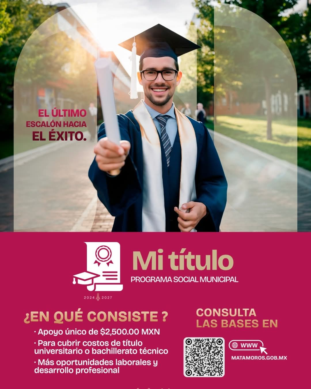 H. Matamoros, Tamaulipas.- El gobierno municipal de Matamoros, encabezado por el alcalde Beto Granados, impulsa el desarrollo profesional de los jóvenes a través del programa social “Mi Título”, el cual ofrece un apoyo económico de 2,500 pesos para cubrir los costos de titulación de estudios universitarios o de bachillerato técnico.