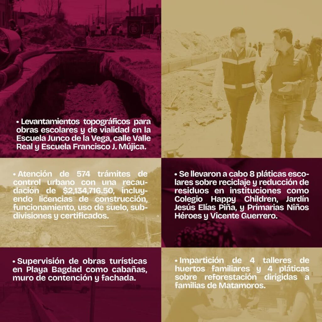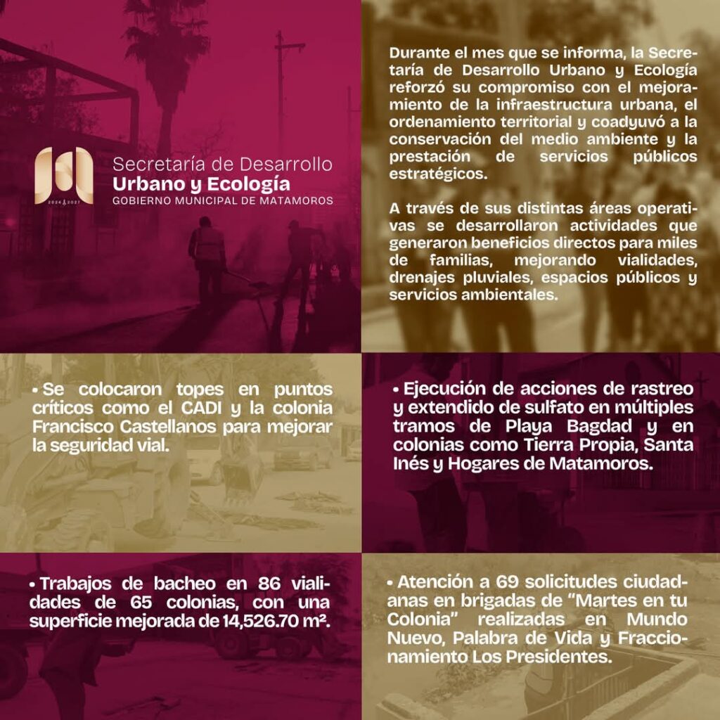 H. Matamoros, Tamaulipas.- Durante el mes de abril, la Secretaría de Desarrollo Urbano y Ecología de Matamoros implementó una serie de acciones enfocadas en mejorar la infraestructura urbana y promover la conciencia ambiental entre la ciudadanía. Estas iniciativas refuerzan el compromiso del gobierno municipal con el bienestar de los habitantes y el desarrollo sostenible de la ciudad.