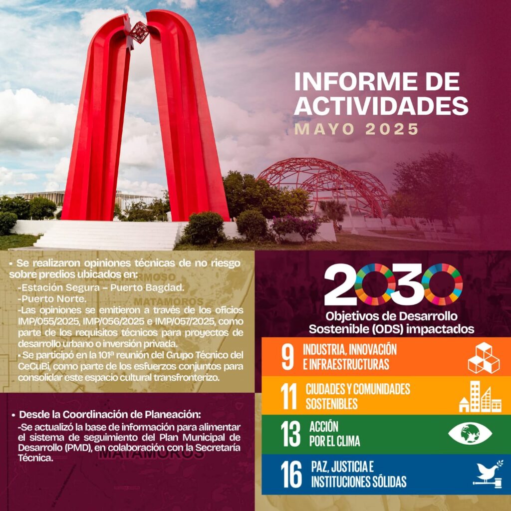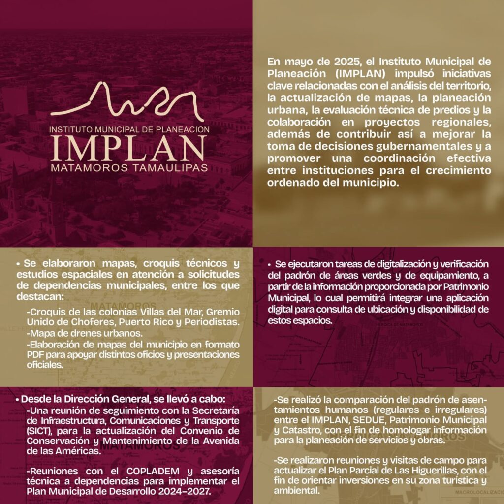 H. Matamoros, Tamaulipas.- Durante el mes de mayo, el gobierno municipal de Matamoros, a través del Instituto Municipal de Planeación (IMPLAN), reafirmó su compromiso con el desarrollo ordenado del municipio mediante la ejecución de estudios técnicos, análisis territoriales y actualizaciones cartográficas. Estas acciones reflejan una gestión enfocada en el bienestar ciudadano y en la construcción de un futuro más sustentable.