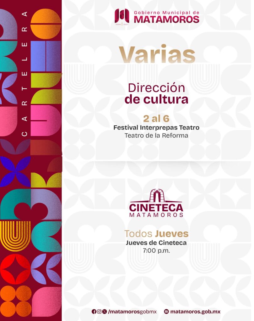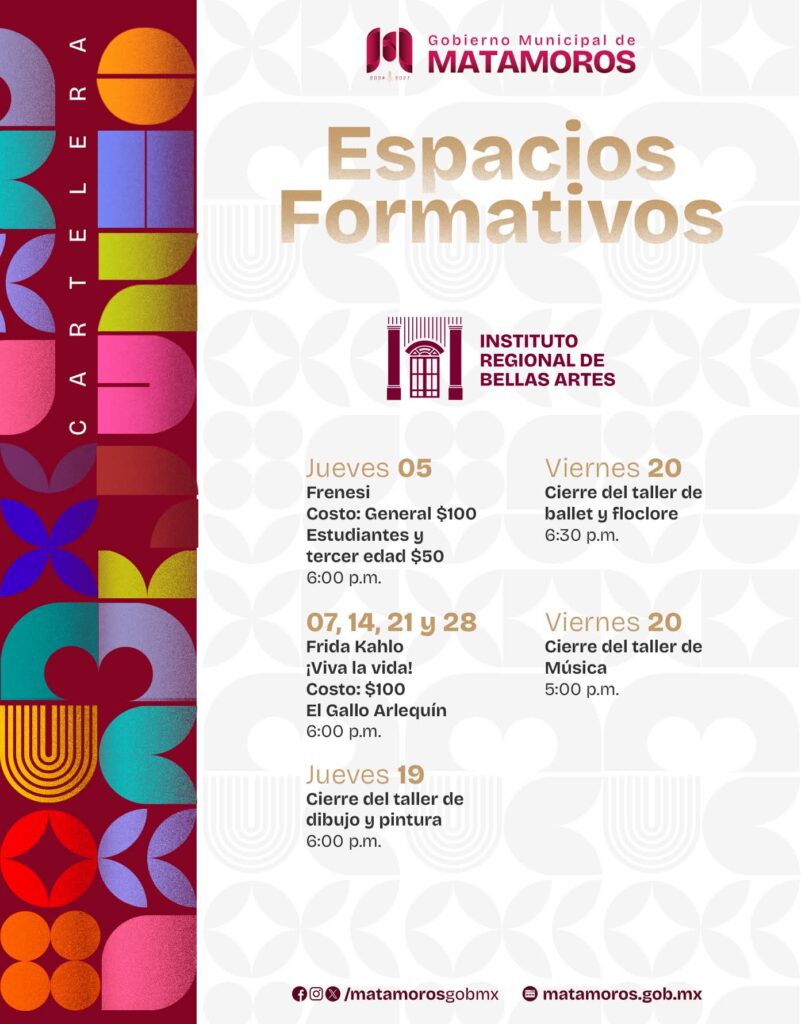 H. Matamoros, Tamaulipas.- El mes de junio ha llegado, y con él, una variada y enriquecedora oferta cultural pensada para toda la comunidad. Desde los más pequeños hasta los adultos mayores, todos podrán disfrutar de una cartelera especialmente diseñada para acercar el arte, la creatividad y la reflexión a todos los sectores de la población.