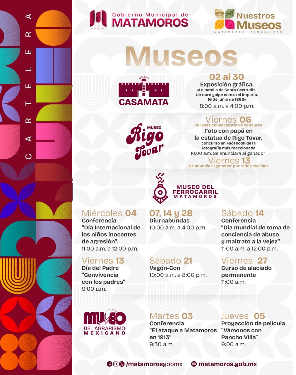 H. Matamoros, Tamaulipas.- El mes de junio ha llegado, y con él, una variada y enriquecedora oferta cultural pensada para toda la comunidad. Desde los más pequeños hasta los adultos mayores, todos podrán disfrutar de una cartelera especialmente diseñada para acercar el arte, la creatividad y la reflexión a todos los sectores de la población.