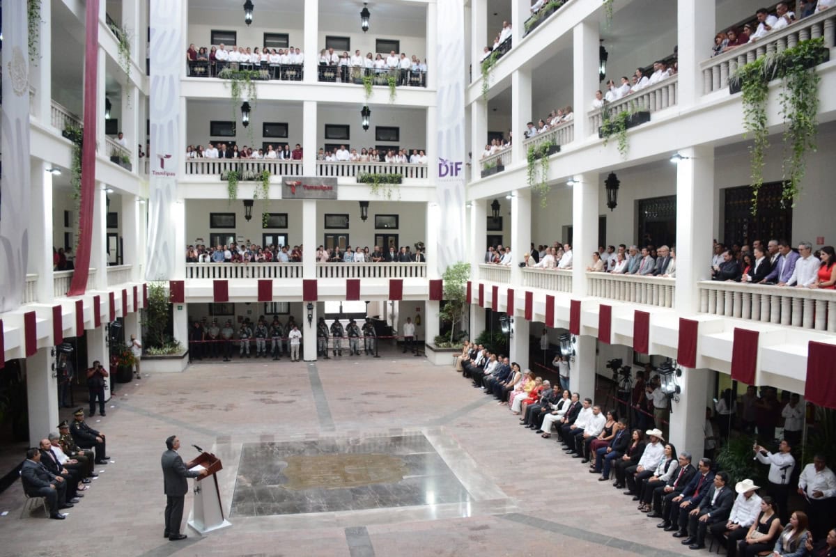 “Por el momento histórico que nos reúne, es un honor en esta ceremonia cívica de honores a la bandera nacional, en la que también rendimos tributo a los símbolos de la entidad tamaulipeca, que podamos recibirles en esta casa, un recinto que se ha dignificado, que recupera presencia y mejora las condiciones para estar a la altura de una sociedad que valora, y que valora mucho, lo que nos pertenece a todos y que forma, además, una parte de nuestra historia”, señaló.