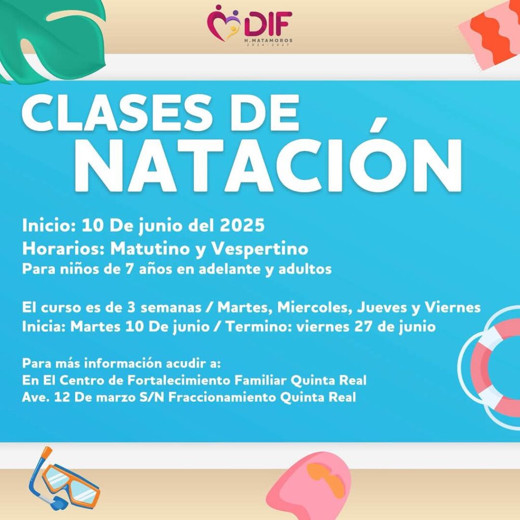 H. Matamoros, Tamaulipas.- El Sistema DIF Matamoros, que preside Ana Ariceaga de Granados, invita a las familias a formar parte de las Clases de Natación, que se llevarán a cabo en las instalaciones del Centro de Fortalecimiento Familiar Quinta Real, con el objetivo de promover la actividad física y el sano esparcimiento durante la temporada de primavera-verano.