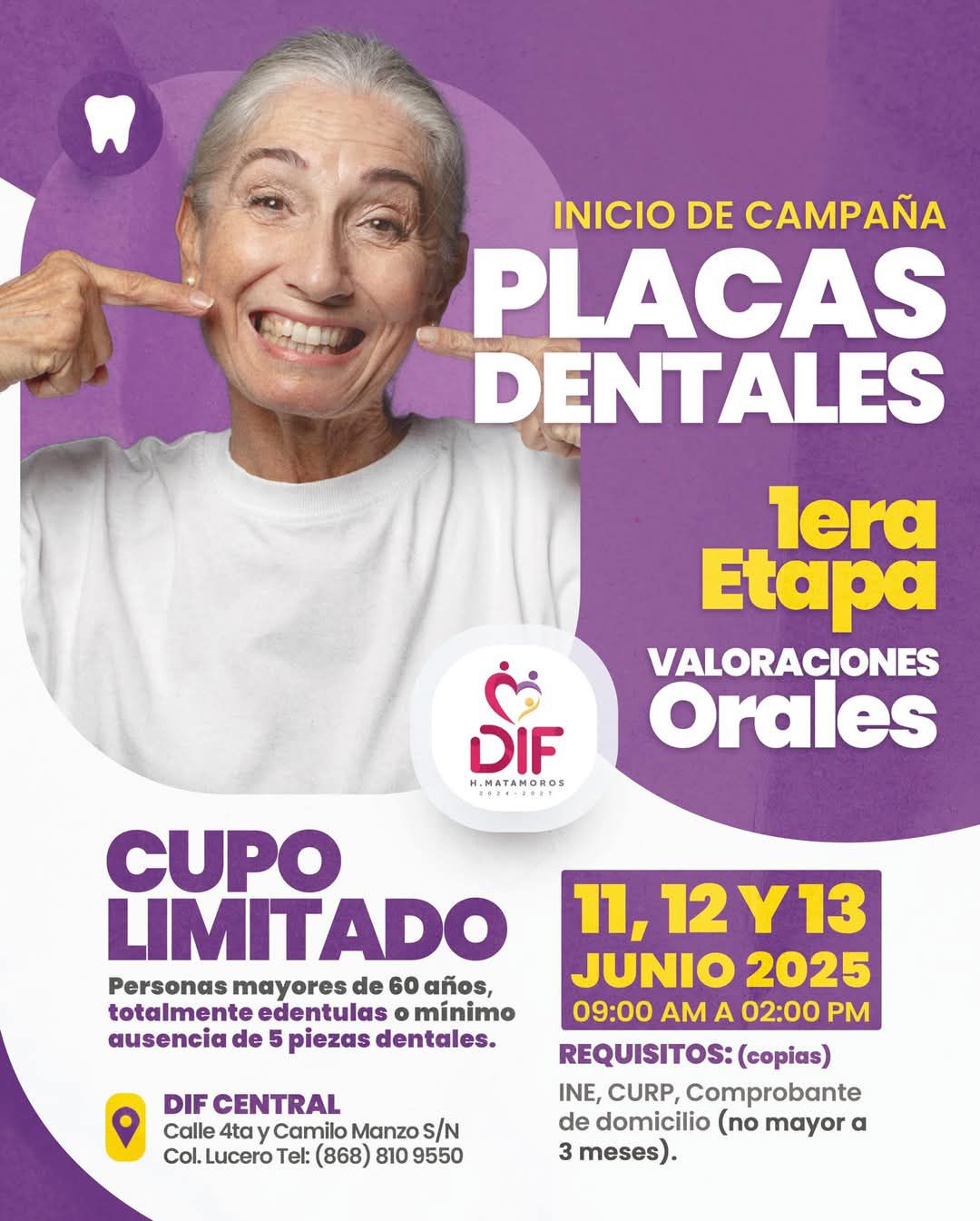 Preocupados por el bienestar y la calidad de vida de los adultos mayores, el Sistema DIF Matamoros invita a sumarse a la campaña de placas dentales, con el objetivo de fortalecer su salud bucal y brindarles mayor confianza en su vida diaria.