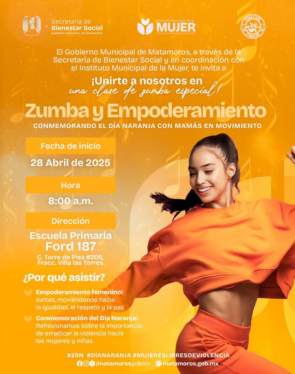 H. Matamoros, Tamaulipas.- Con el firme compromiso de promover el bienestar integral de la ciudadanía, el Gobierno Municipal de Matamoros, a través de la Secretaría de Bienestar Social y en coordinación con el Instituto Municipal de la Mujer, hizo una invitación a las féminas para participar en la Clase Especial de Zumba y Empoderamiento, pensada especialmente para fortalecer el cuerpo, la mente y el espíritu.