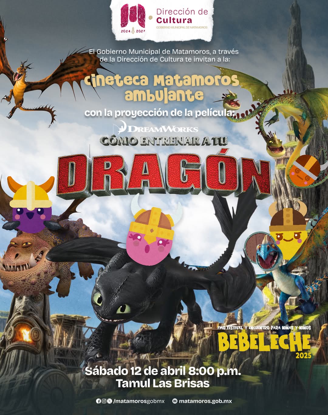 H. Matamoros, Tamaulipas.- El gobierno municipal que encabeza el alcalde Beto Granados invita a todas las familias a disfrutar de una noche de cine al aire libre este sábado 12 de abril, con la proyección de la película “Cómo entrenar a tu dragón”, en la Cineteca Matamoros Ambulante.