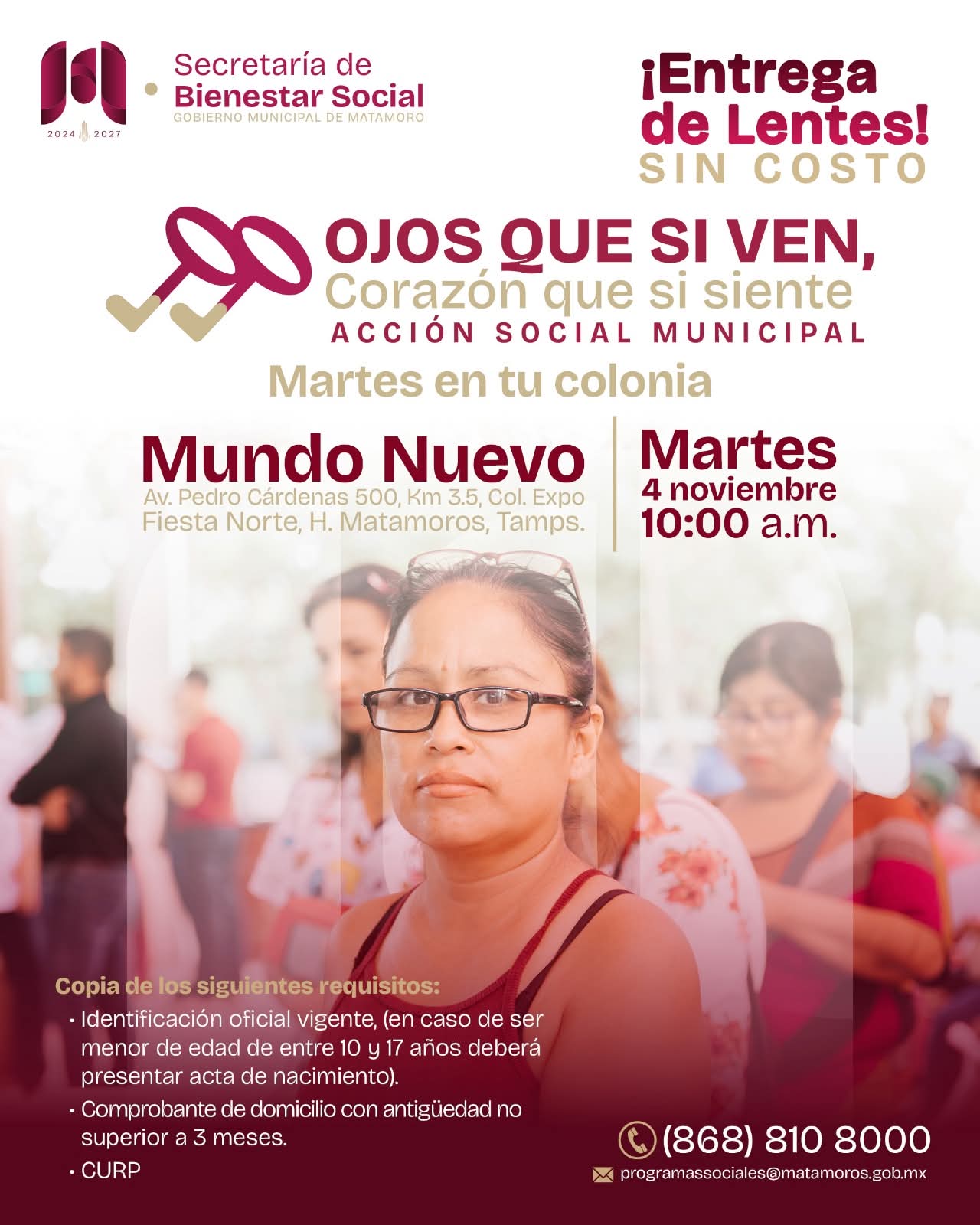 H. Matamoros, Tamaulipas.– El Gobierno de Beto Granados invita a la ciudadanía a participar en la jornada de entrega gratuita de lentes que se realizará este martes en el Centro de Convenciones Mundo Nuevo, como parte del programa “Ojos que sí ven, corazón que sí siente”, impulsado por la Secretaría de Bienestar Social. Esta acción forma parte de los esfuerzos permanentes por acercar bienestar y atención médica a las familias matamorenses.