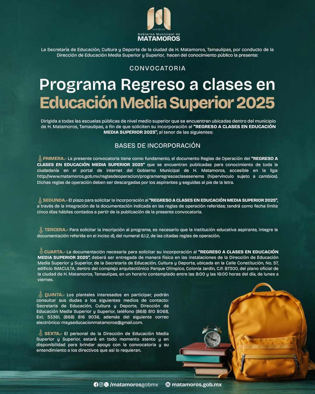 H. Matamoros, Tamaulipas.- Con el objetivo de mejorar las instalaciones educativas y fortalecer la comunidad escolar, se invita a todas las instituciones de nivel medio superior del municipio a participar en el programa Regreso a Clases en Educación Media Superior 2025.