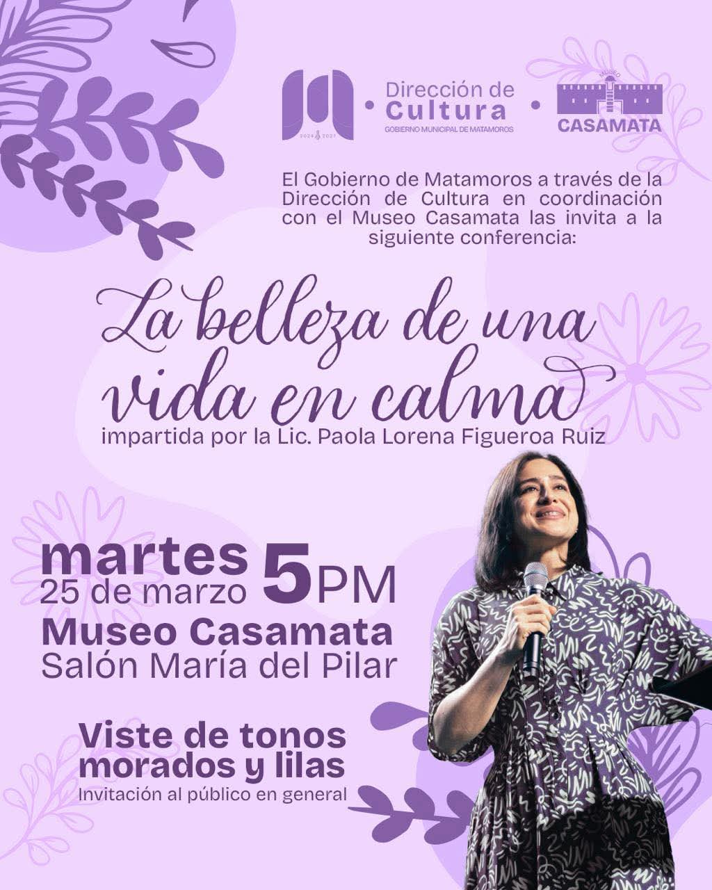 H. Matamoros, Tamaulipas.- El Gobierno de Matamoros invita a la ciudadanía a la conferencia La Belleza de una Vida en Calma, que será impartida por la licenciada Paola Lorena Figueroa Ruiz.
