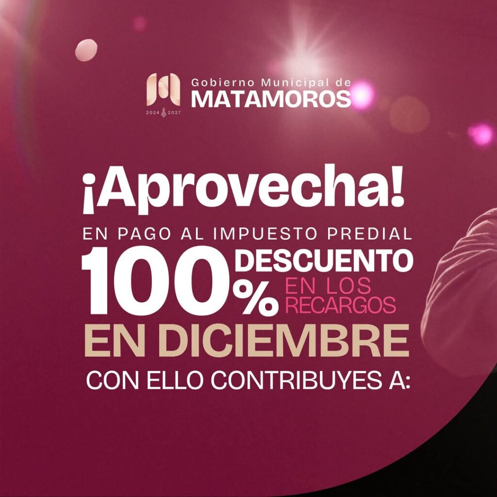 Durante este mes de diciembre, se está ofreciendo un descuento del 100% en los recargos de este impuesto, incentivando a los matamorenses a regularizarse y contribuir al mejoramiento de su comunidad.
