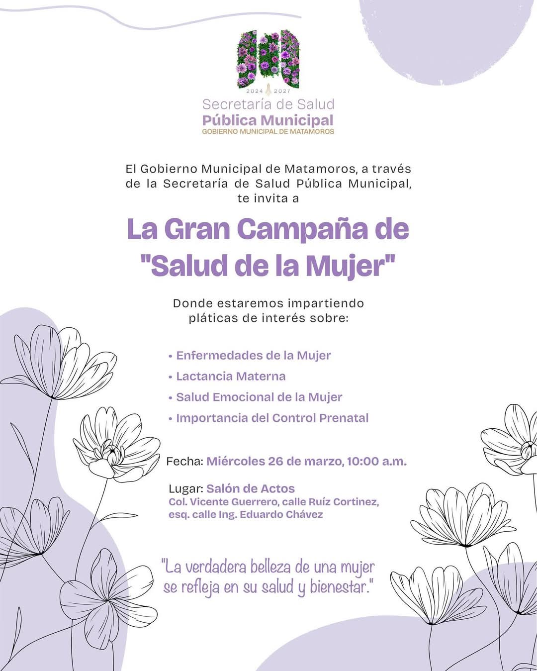 H. Matamoros, Tamaulipas.- El Gobierno de Matamoros, a través de la Secretaría de Salud Pública Municipal, invita a todas las mujeres a participar en “La Gran Campaña de Salud en la Mujer”, una jornada informativa y preventiva enfocada en el bienestar integral femenino.