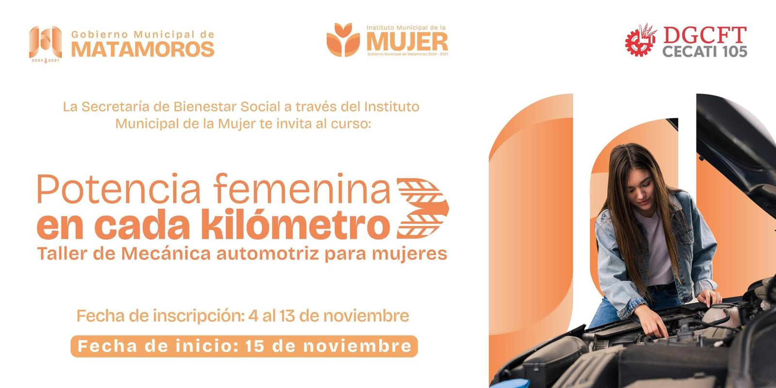 Matamoros, Tamaulipas. La Secretaría de Bienestar Social del gobierno municipal, en conjunto con el Instituto Municipal de la Mujer, ha anunciado el inicio del taller de mecánica automotriz “Potencia femenina en cada kilómetro”. Este curso está diseñado para mujeres de Matamoros que deseen adquirir conocimientos prácticos de mecánica básica y mantenimiento de sus vehículos, fortaleciendo su autonomía y confianza al volante.
