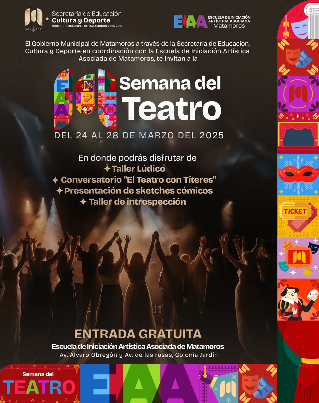 H. Matamoros, Tamaulipas.- El Gobierno Municipal, a través de la Secretaría de Educación, Cultura y Deportes, en coordinación con la Escuela de Iniciación Artística Asociada de Matamoros, invita a la comunidad a sumarse a la Semana del Teatro, que se llevará a cabo del 24 al 28 de marzo.