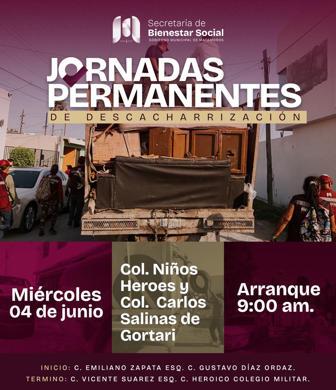 H. Matamoros, Tamaulipas.- La salud y el bienestar de nuestras comunidades es una prioridad, por ello, este miércoles 4 de junio, a partir de las 9:00 de la mañana, las Jornadas permanentes de descacharrización estarán presentes en las colonias Niños Héroes y Carlos Salinas de Gortari.