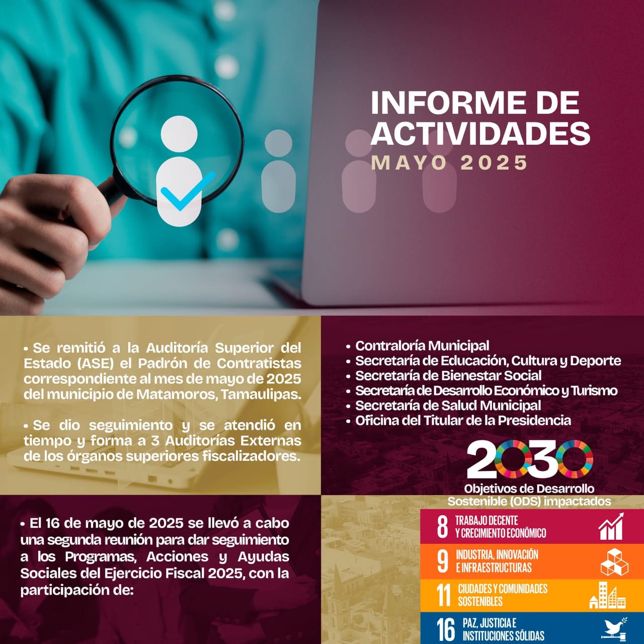 H. Matamoros, Tamaulipas.- En el marco del compromiso con la rendición de cuentas y el uso eficiente de los recursos públicos, durante el mes de mayo, la Contraloría Municipal intensificó sus labores de supervisión y control interno en distintas áreas del gobierno local.