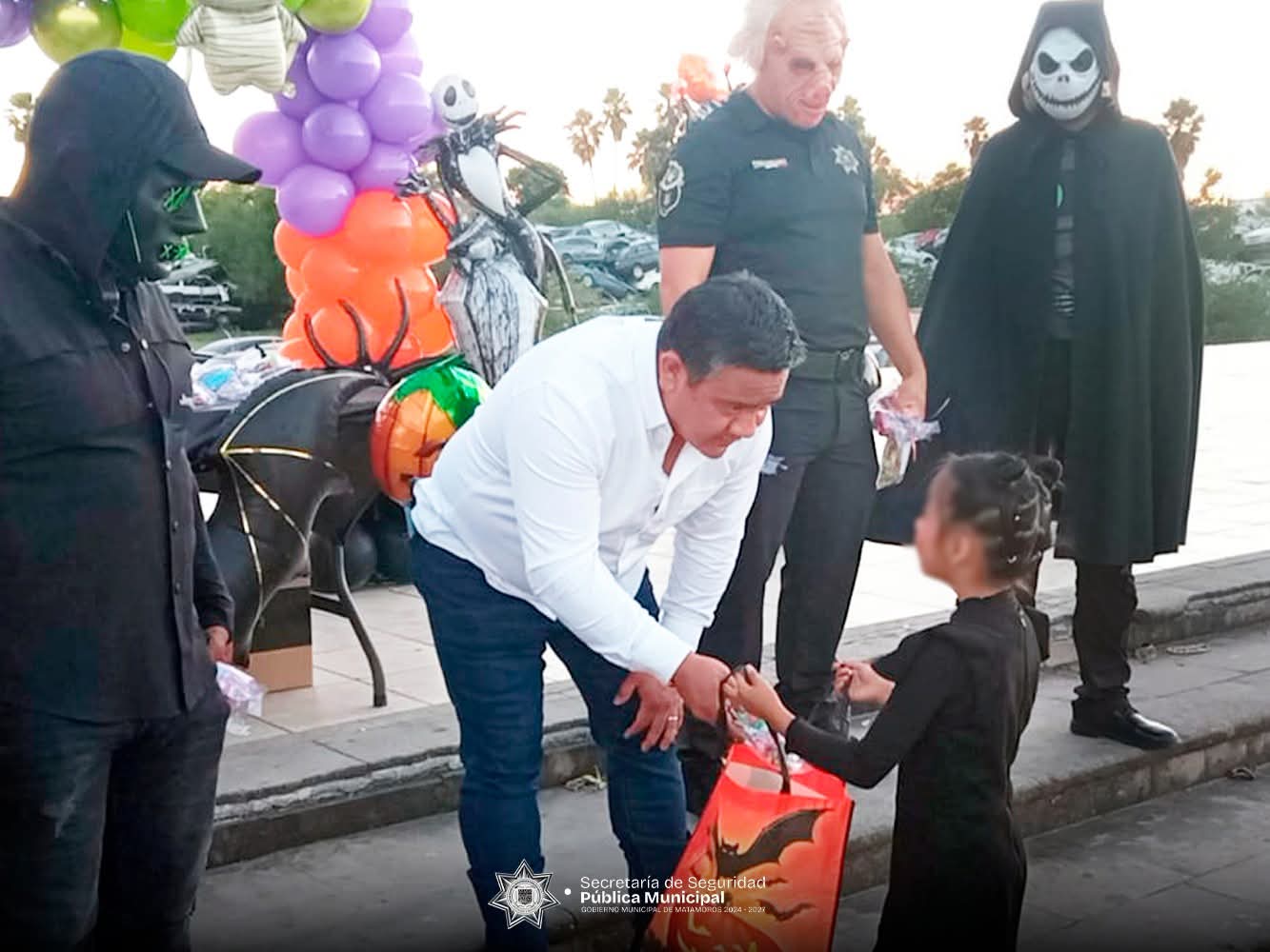 H. Matamoros, Tamaulipas.- La Secretaría de Seguridad Pública y Vialidad Municipal de Matamoros llevó sonrisas y alegría a más de 3,000 niños y niñas durante la tradicional entrega de bolsitas de dulces con motivo del 31 de octubre y Día de Muertos. La actividad tuvo como objetivo fomentar la convivencia y fortalecer los lazos entre la corporación y las familias matamorenses.