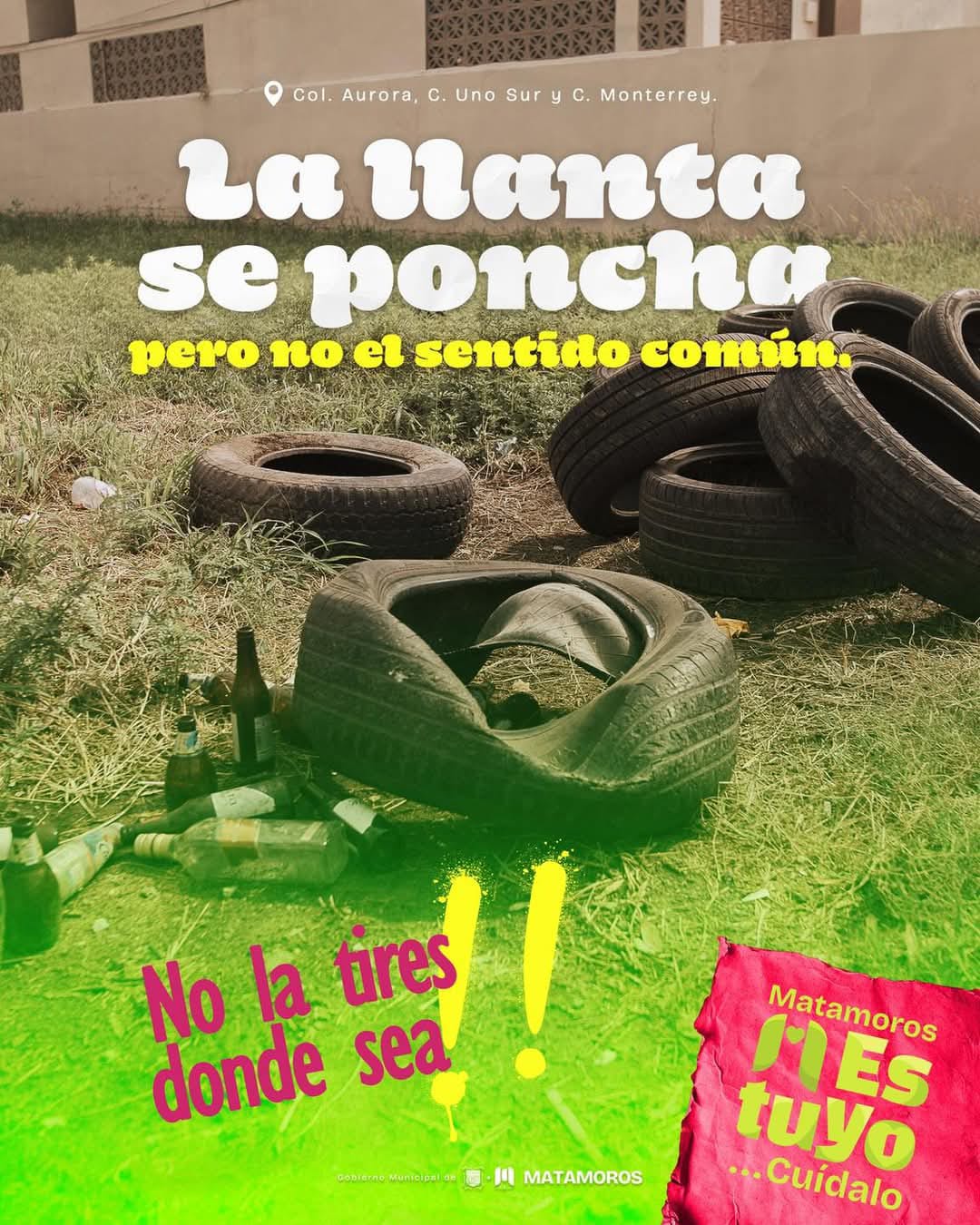 H. Matamoros, Tamaulipas.– Con el objetivo de fomentar la cultura del cuidado ambiental y la salud pública, el alcalde Beto Granados puso en marcha una campaña de concientización bajo el lema “La llanta se poncha, pero no el sentido común. No la tires donde sea”. Esta iniciativa busca reducir la mala práctica de abandonar llantas en la vía pública, una acción que genera contaminación, obstruye drenajes y propicia criaderos de enfermedades.