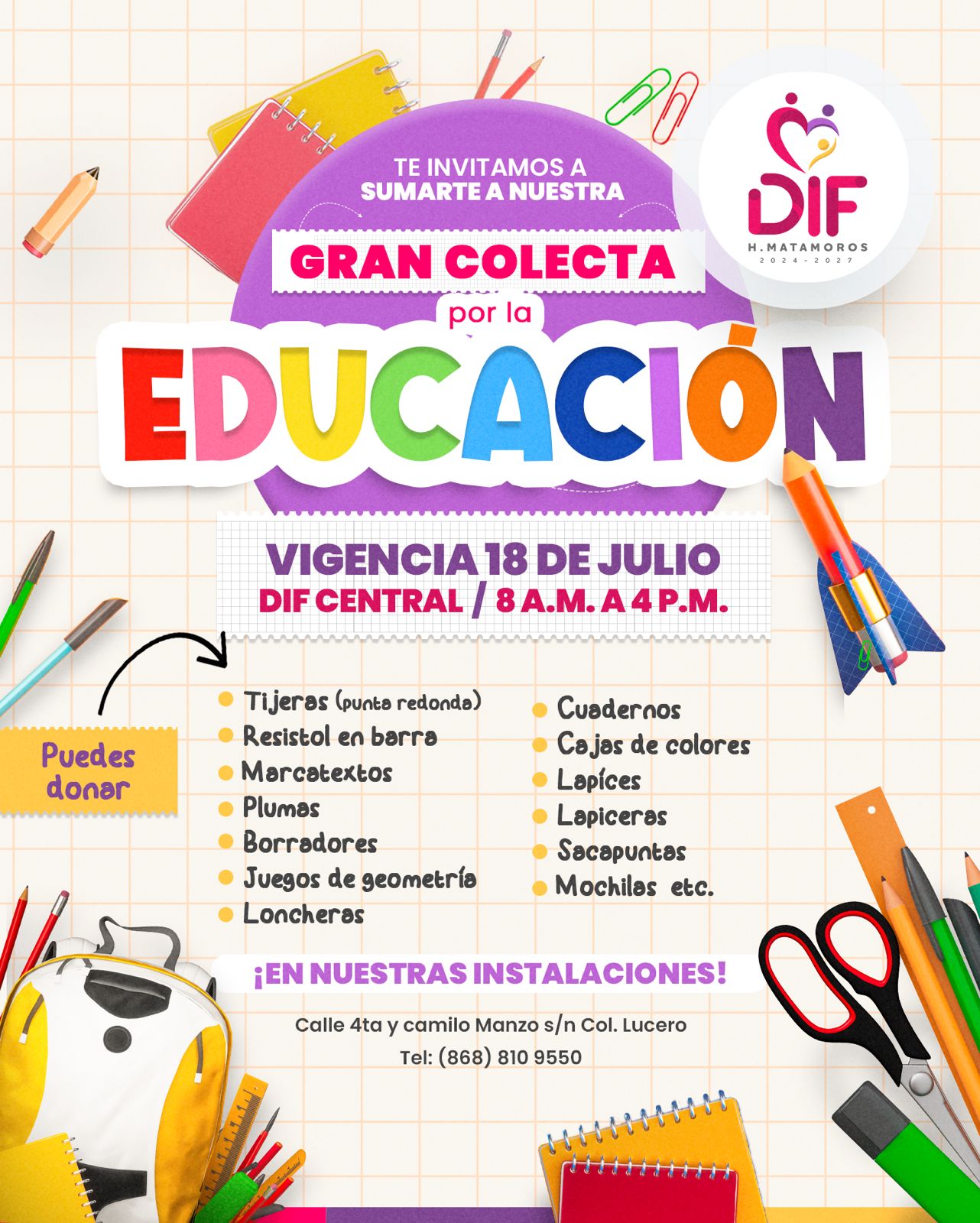 Esta campaña, invita a los ciudadanos a donar útiles escolares nuevos, tales como cuadernos, lápices, colores, mochilas, loncheras, plumas, borradores, sacapuntas y juegos de geometría. Las donaciones pueden entregarse en las instalaciones del Sistema DIF, ubicada en la calle 4ta. y Camilo Manzo, en horario de 8:00 de la mañana a 4:00 de la tarde, teniendo como fecha límite hasta el 18 de julio.