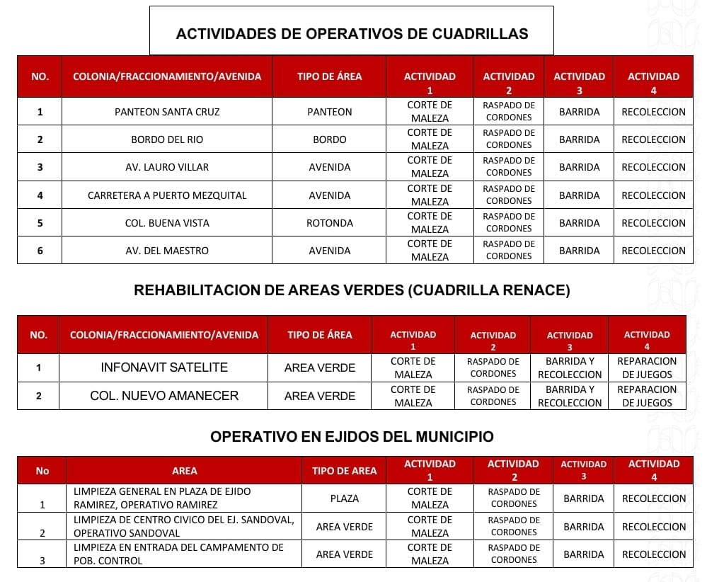 Matamoros, Tam.- El Gobierno de Beto Granados realizará este día trabajos de limpieza en Áreas Verdes, Espacios Públicos y Camellones de los siguientes lugares; por lo que te pedimos; conducir con cuidado.