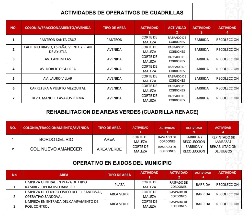 El Gobierno de Beto Granados realizará este día trabajos de limpieza en Áreas Verdes, Espacios Públicos y Camellones de los siguientes lugares; por lo que te pedimos; conducir con cuidado.