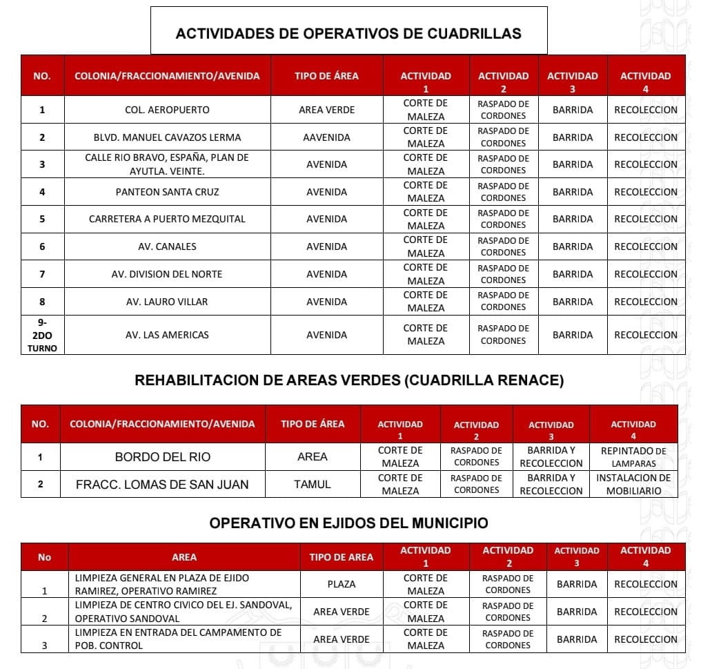 El Gobierno de Beto Granados realizará este día trabajos de limpieza en Áreas Verdes, Espacios Públicos y Camellones de los siguientes lugares; por lo que te pedimos; conducir con cuidado.