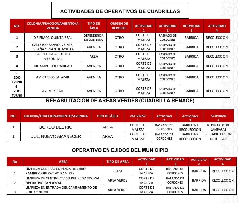 El Gobierno de Beto Granados realizará este día trabajos de limpieza en Áreas Verdes, Espacios Públicos y Camellones de los siguientes lugares; por lo que te pedimos; conducir con cuidado.