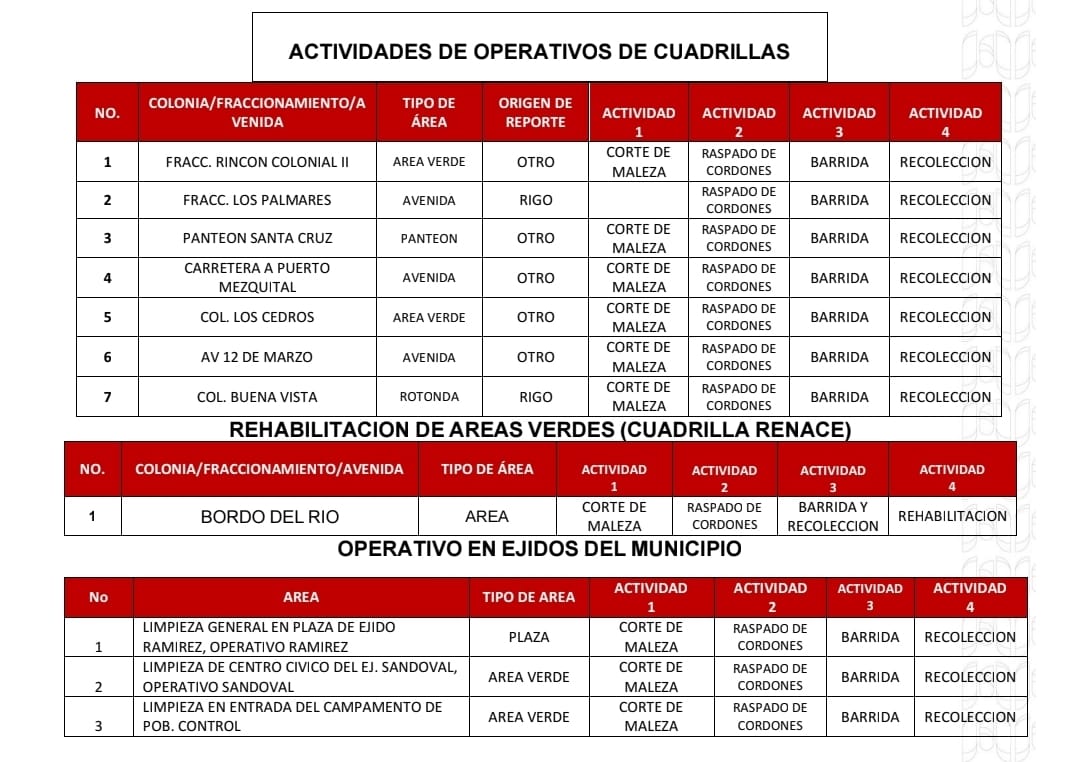 El Gobierno de Beto Granados realizará este día trabajos de limpieza en Áreas Verdes, Espacios Públicos y Camellones de los siguientes lugares; por lo que te pedimos; conducir con cuidado.