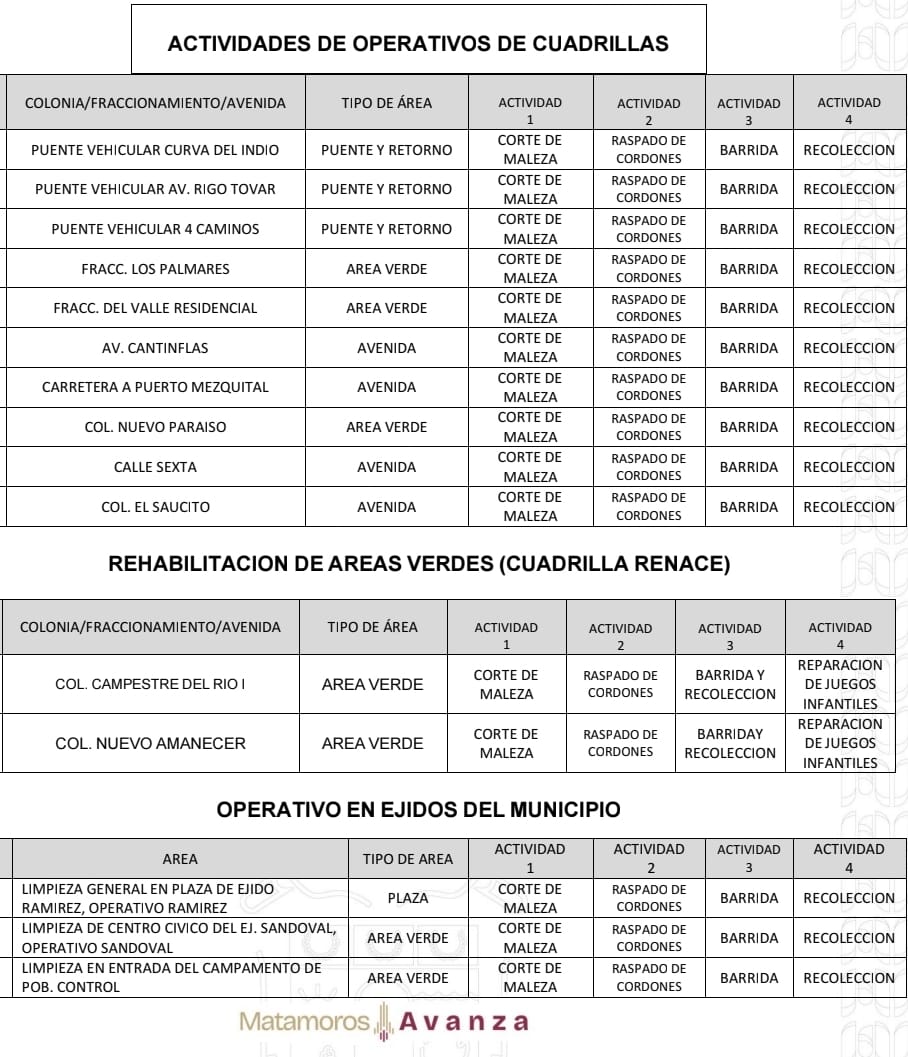 El Gobierno de Beto Granados realizará este día trabajos de limpieza en Áreas Verdes, Espacios Públicos y Camellones de los siguientes lugares; por lo que te pedimos; conducir con cuidado.