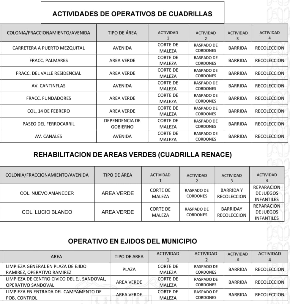 El Gobierno de Beto Granados realizará este día trabajos de limpieza en Áreas Verdes, Espacios Públicos y Camellones de los siguientes lugares; por lo que te pedimos; conducir con cuidado.