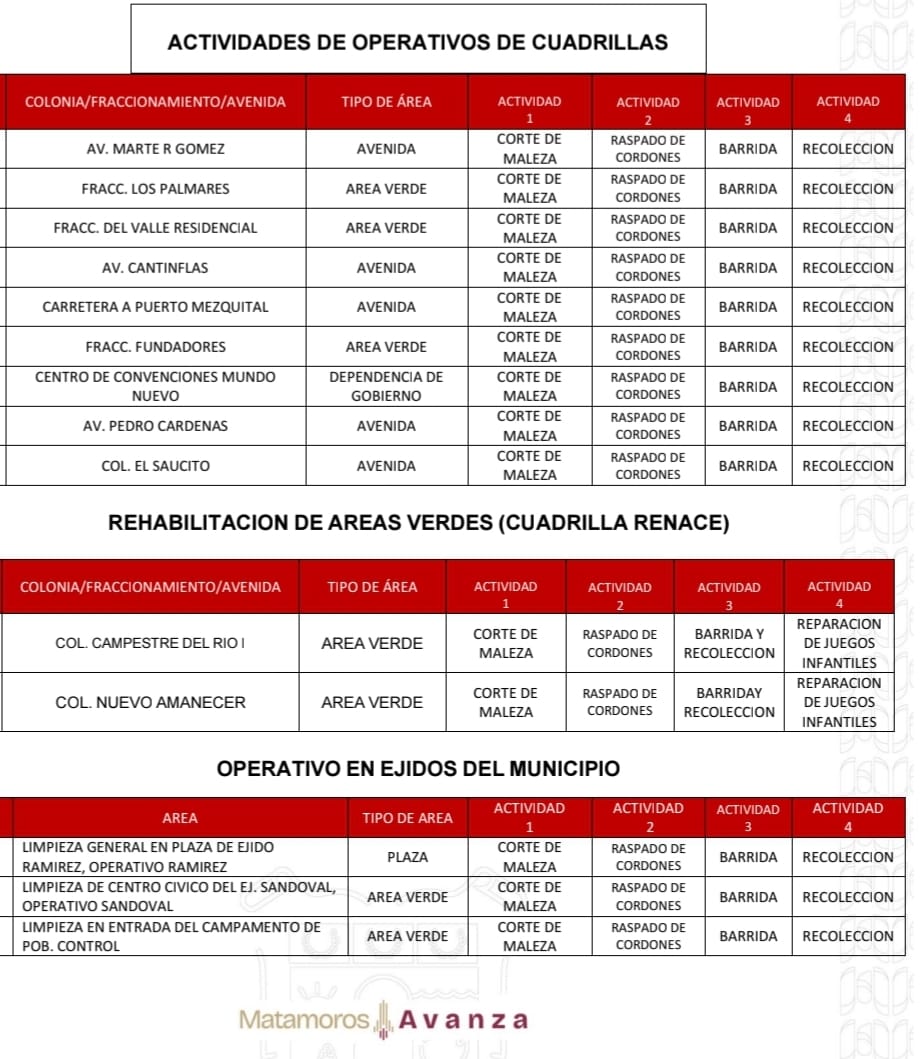 El Gobierno de Beto Granados realizará este día trabajos de limpieza en Áreas Verdes, Espacios Públicos y Camellones de los siguientes lugares; por lo que te pedimos; conducir con cuidado.