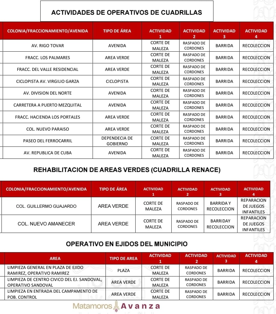 El Gobierno de Beto Granados realizará este día trabajos de limpieza en Áreas Verdes, Espacios Públicos y Camellones de los siguientes lugares; por lo que te pedimos; conducir con cuidado.