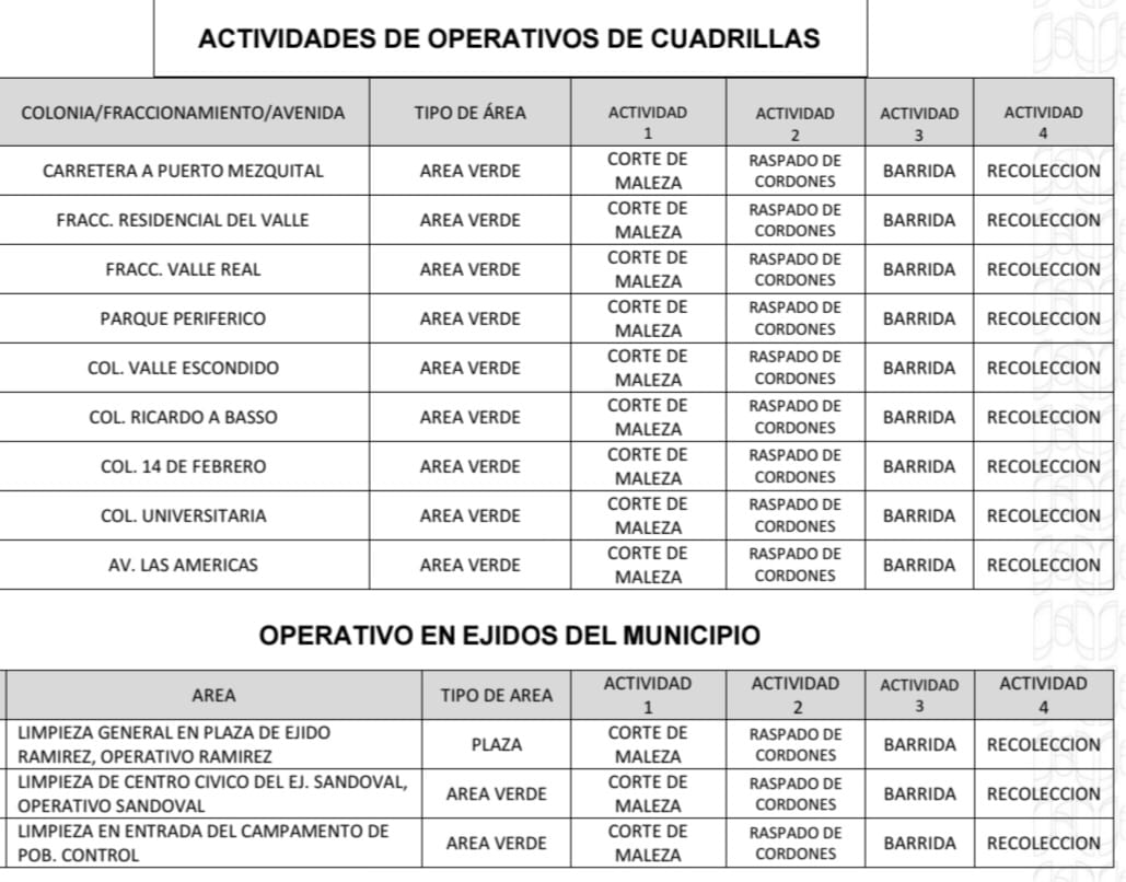 El Gobierno de Beto Granados realizará este día trabajos de limpieza en Áreas Verdes, Espacios Públicos y Camellones de los siguientes lugares; por lo que te pedimos; conducir con cuidado.